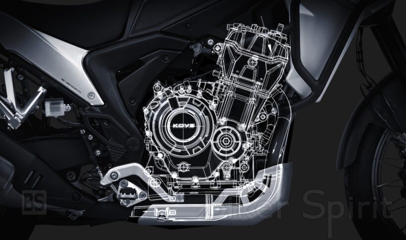 Στην καρδιά της βρίσκεται ένας σύγχρονος, υγρόψυκτος, δικύλινδρος σε σειρά κινητήρας 581cc, με δύο εκκεντροφόρους επικεφαλής, 8βάλβιδος και σύστημα τροφοδοσίας BOSCH EFI. Η ισχύς φτάνει τους 63 ίππους στις 8.500 rpm – μετρημένη στον στρόφαλο, βάσει έγκρισης τύπου – ενώ η ροπή αγγίζει τα 56,5 Nm στις 6.250 rpm, διαμορφώνοντας ένα σύνολο με γεμάτη λειτουργία στο μεσαίο φάσμα και άμεση απόκριση στο άνοιγμα του γκαζιού.