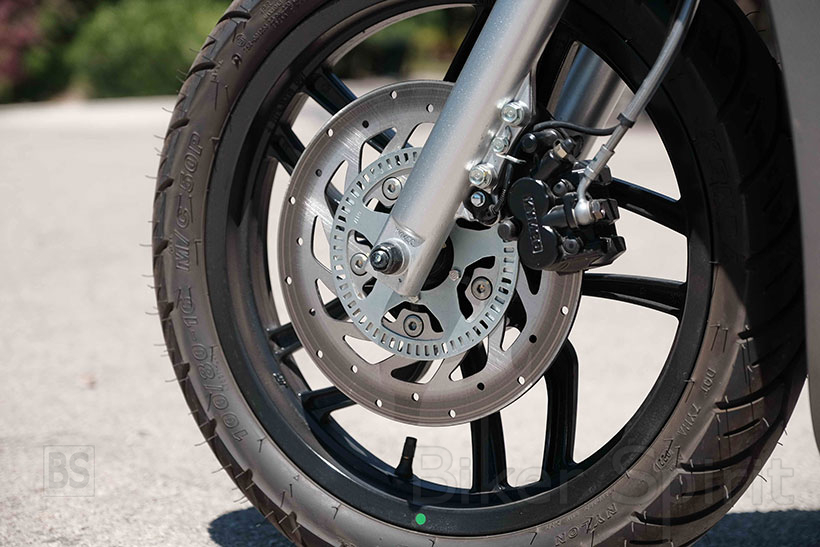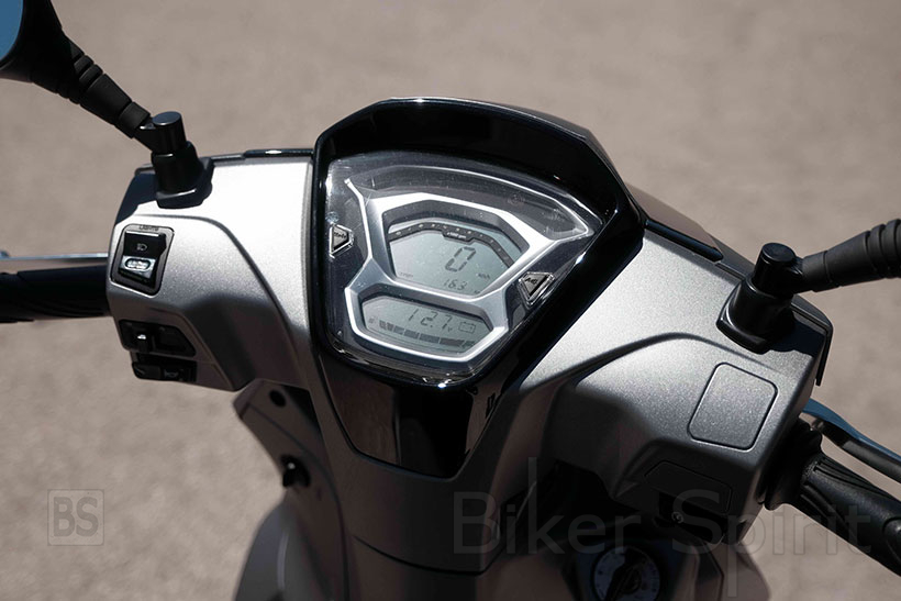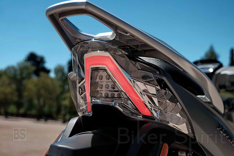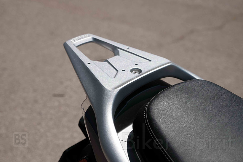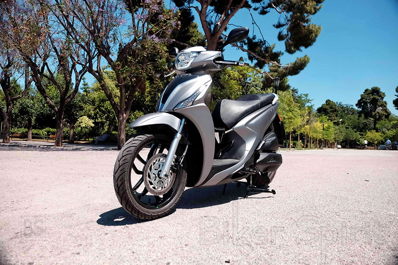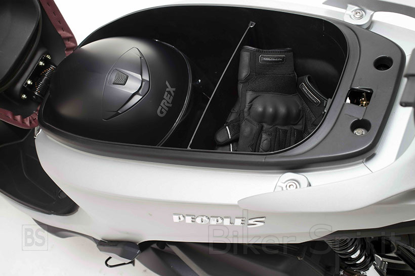 Ο τροχός μπροστά παραμένει στις 16”, ενώ ο αντίστοιχος πίσω είναι στις 14” προκειμένου να εξοικονομηθεί ο απαραίτητος χώρος κάτω από τη σέλα, όπου μπορούν να φιλοξενηθούν ένα full face κράνος και αρκετά άλλα αντικείμενα. Υπάρχει μάλιστα και αφαιρούμενο διαχωριστικό, που αφενός επιτρέπει να μεταβάλλεται ο χώρος αυτός ανάλογα με τις εκάστοτε απαιτήσεις του αναβάτη και αφετέρου εμποδίζει την μετακίνησή των αντικειμένων που φιλοξενούνται κάτω από τη σέλα. Ο χώρος φωτίζεται από ένα φωτιστικό LED και διαθέτει μια δεύτερη θύρα USB (η πρώτη βρίσκεται στο τιμόνι) για φόρτιση μεγαλύτερων ηλεκτρονικών συσκευών. Σημαντικό στοιχείο η διατήρηση του επίπεδου πατώματος, που συνδυαστικά με το υπάρχον άγκιστρο χειραποσκευών αυξάνει σημαντικά τη δυνατότητα μεταφοράς αντικειμένων.