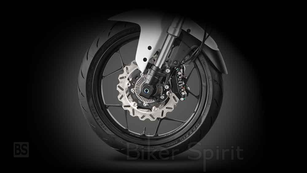 Η SRK 400 διαθέτει επίσης και ένα ολοκληρωμένο πακέτο ασφάλειας με τους δύο “κυματιστούς” δίσκους 260mm μπροστά και τις τετραπίστονες δαγκάνες, που συνδυάζονται με το δικάναλο σύστημα ABS 9.1MB της Bosch, ενώ πίσω διαθέτει ένα δίσκο 240mm με δαγκάνα ενός εμβόλου.