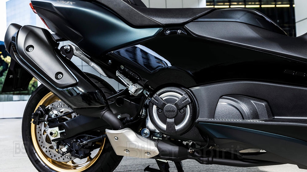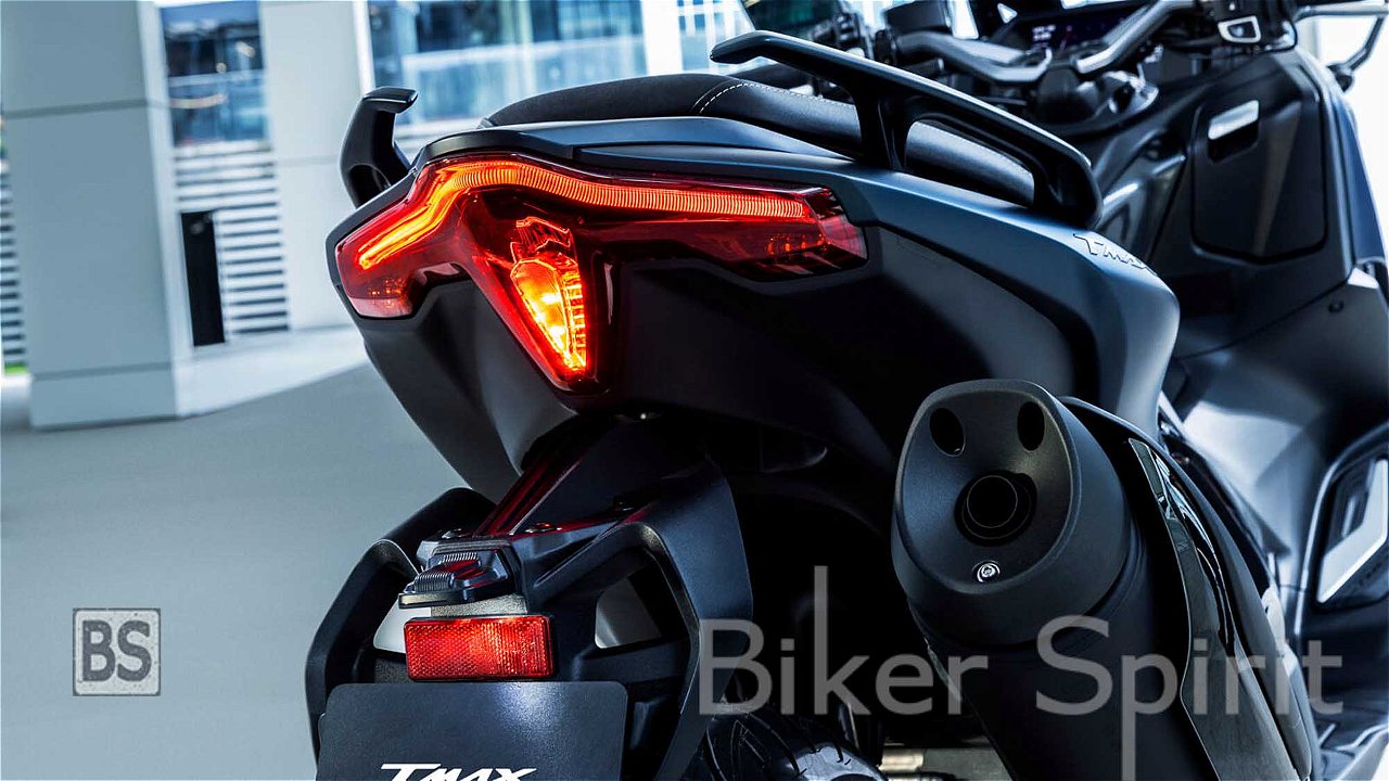 Το πίσω μέρος του TMAX έχει το ίδιο εντυπωσιακή εμφάνιση με το μπροστινό, και το νέο πίσω φως διαθέτει την αποκλειστική για το συγκεκριμένο μοντέλο σχεδίαση σε σχήμα T με ενσωματωμένα φλας, ενισχύοντας τη δυναμική και τολμηρή παρουσία αυτής της μηχανής υψηλών επιδόσεων.