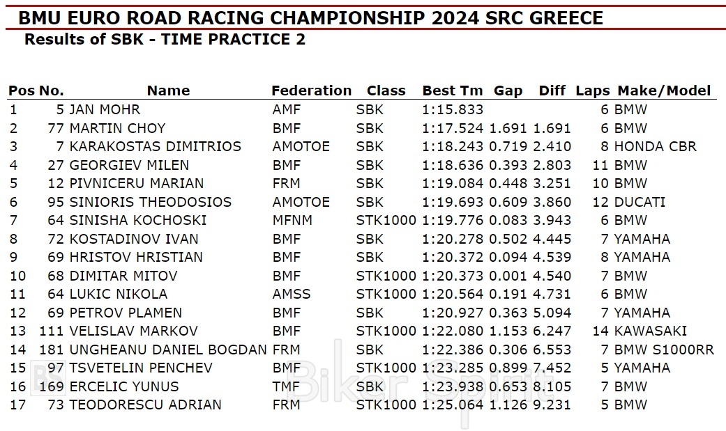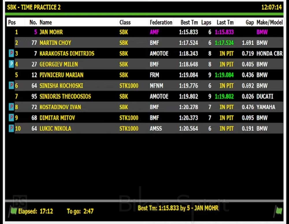 Το χρονόμετρο σταμάτησε στο απίστευτο 1:15.833 από τον Αυστριακό Jan Mohr, πάνω στην σέλα ενός BMW M1000RR και με ελαστικά Pirelli Superbike slick με γόμες SC1 μπροστά και SCQ πίσω, ενώ την Παρασκευή στο TIME PRACTICE 1 είχε ήδη γράψει 1:16.755, χρόνος που ήταν πολύ κοντά στο προηγούμενο δικό του ρεκόρ.