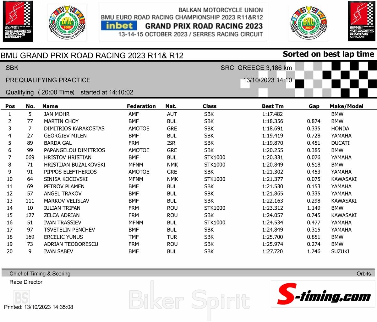 Το χρονόμετρο σταμάτησε στο 1:17.182 από τον Αυστριακό Jan Mohr, πάνω στην σέλα ενός BMW M1000RR και σημειώθηκε στα πρώτα χρονομετρημένα στον 3ο του γύρο, ενώ είχε καταρρίψει το ρεκόρ αρκετές φορές από το πρωί της Παρασκευής!