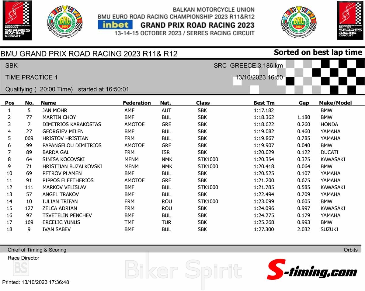 Το νέο απόλυτο ρεκόρ πίστας με 1:17.182, από τον Αυστριακό Jan Mohr, καταγράφηκε, στην πρώτη ημέρα των δοκιμαστικών του διπλού και τελευταίου αγώνα του Βαλκανικού πρωταθλήματος ταχύτητας (BMU European Road Racing Championship 2023) στην πίστα των Σερρών, όπου διεξάγεται και το Πανελλήνιο Πρωτάθλημα Ταχύτητας!