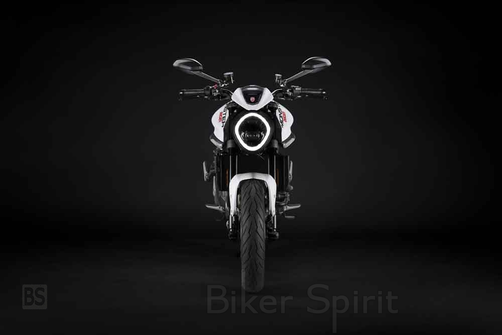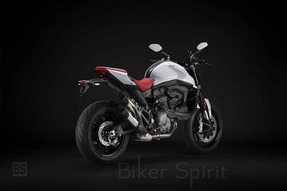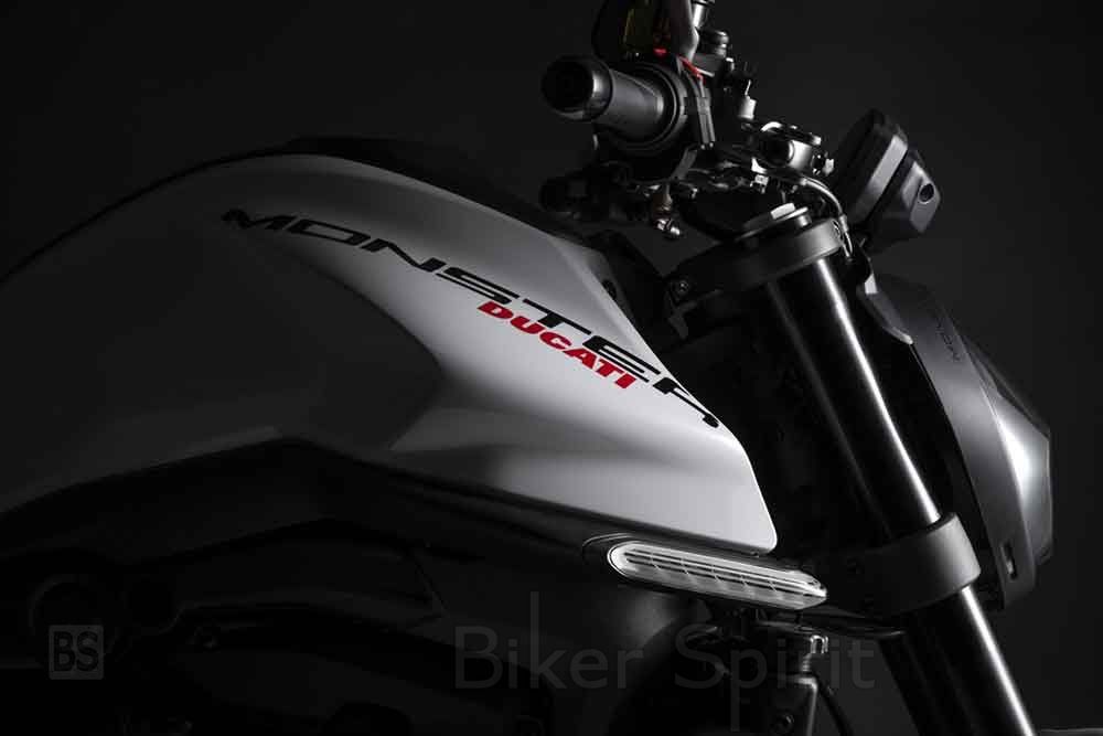 Ο μοντέρνος και εκλεπτυσμένος σχεδιασμός εστιάζει στα βασικά και ενισχύει τα ιδιαίτερα χαρακτηριστικά του Monster. Ενώ η μπροστινή όψη της μοτοσυκλέτας κυριαρχείται από τον full LED προβολέα, στο πίσω μέρος υπάρχει μια κοντή και σπορ ουρά, με δύο βαμμένα πλαϊνά πάνελ εμπνευσμένα από το Panigale V4. Στο κέντρο, το αδιαμφισβήτητο καμπύλο και μυώδες ρεζερβουάρ καυσίμου του Monster.