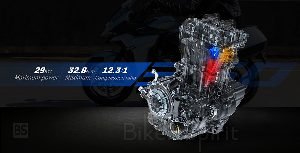 Μέσα στο ατσάλινο σωληνωτό πλαίσιο φιλοξενείται ο εντελώς νέος σχεδιαστικά μονοκύλινδρος, τετραβάβιδος, με δύο επικεφαλής εκκεντροφόρους, υγρόψυκτος κινητήρας (ίδιος με των 350T2, V350 και 350R1), ο οποίος αποδίδει 39,5 ίππους στις 9.500 στροφές και μέγιστη ροπή 32,8Nm στις 7.500 στροφές αντίστοιχα, χάρη και στην υψηλή σχέση συμπίεσης με λόγο 12,3:1. Πρόκειται για ένα κινητήρα σχεδιασμένο από λευκό χαρτί, με υπερτετράγωνες διαστάσεις 84,5mm x 62mm και σύστημα λίπανσης υγρού κάρτερ. Ο ψεκασμός προέρχεται από την τελευταία γενιά ψεκασμών της Bosch, διασφαλίζοντας τη σωστή διαχείριση καυσίμου, ενώ έχει αυξηθεί και η απόδοση της γεννήτριας με ταυτόχρονη μείωση της θερμοκρασίας λειτουργίας και των απαραίτητων διαστημάτων συντήρησης. Παράλληλα συνδυάζει και τη χαμηλή κατανάλωση, επιστρατεύοντας τις πιο σύγχρονες τεχνολογίες μηχανουργικών κατεργασιών, επεξεργασίας μετάλλων και μεθόδους χύτευσης. Για παράδειγμα, ο χωρίς επίστρωση εσωτερικά κύλινδρος διαθέτει λεπτά τοιχώματα, χάρη στη μέθοδο χύτευσης του αλουμινίου που εξέλιξε το εργοστάσιο, με αποτέλεσμα να υπάρξει δυνατότητα για πιο φαρδιές διόδους ψυκτικού και κατ’ επέκταση καλύτερη απαγωγή της θερμότητας. Το κιβώτιο είναι έξι σχέσεων, ενώ ο συμπλέκτης είναι μονόδρομος συμβάλλοντας στην προβλέψιμη συμπεριφορά της μοτοσυκλέτας στα κατεβάσματα των σχέσεων.