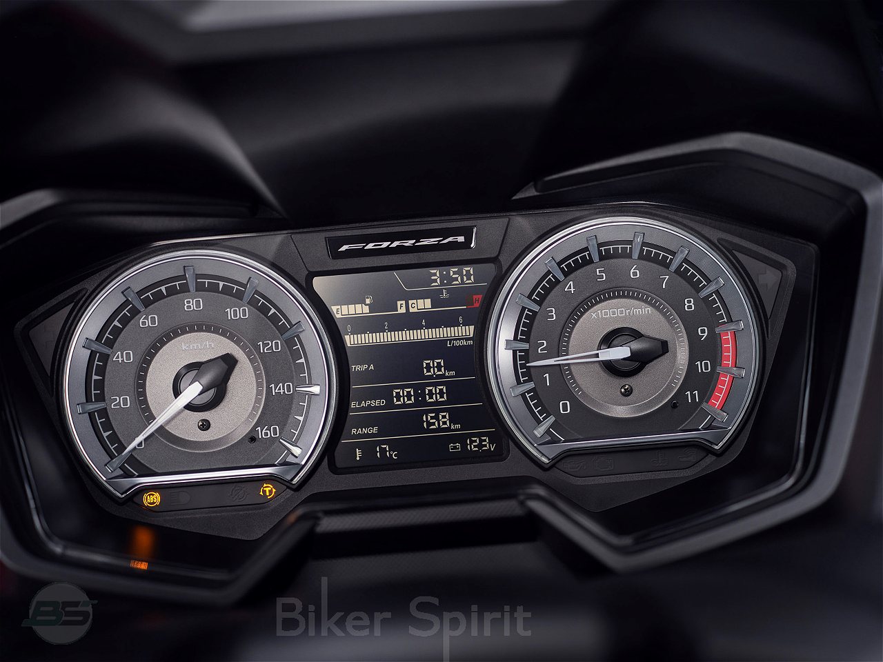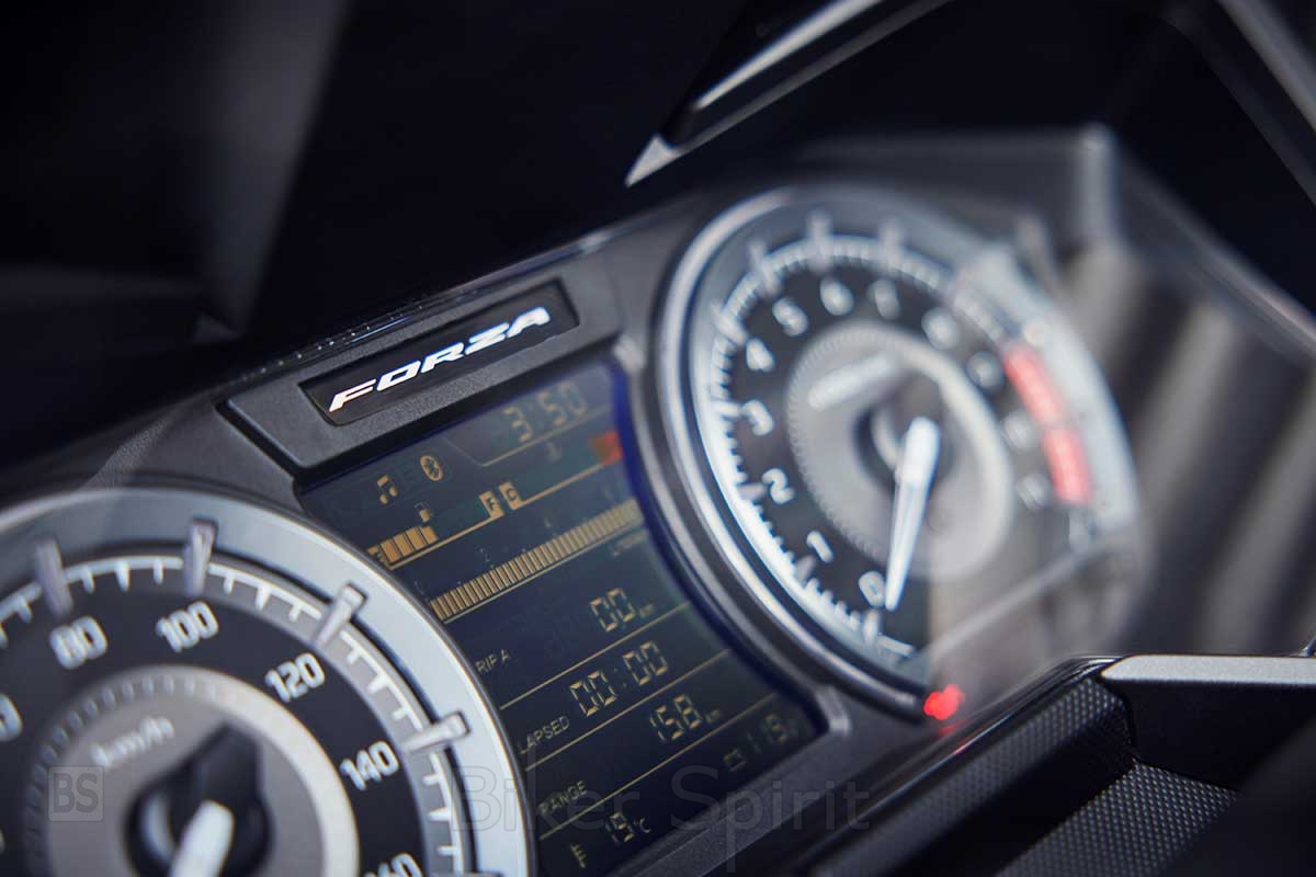 Ο πίνακας οργάνων έχει ανανεωθεί με τον αναβάτη του Forza 350 να απολαμβάνει επίσης τη δυνατότητα σύνδεσης με το smartphone του μέσω Bluetooth και του συστήματος Honda Smartphone Voice Control*, το οποίο για το 23YM είναι επίσης συμβατό με συσκευές IOS και Android.