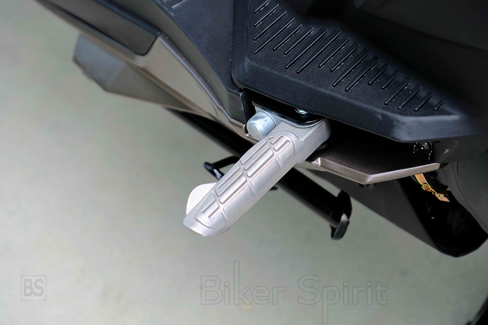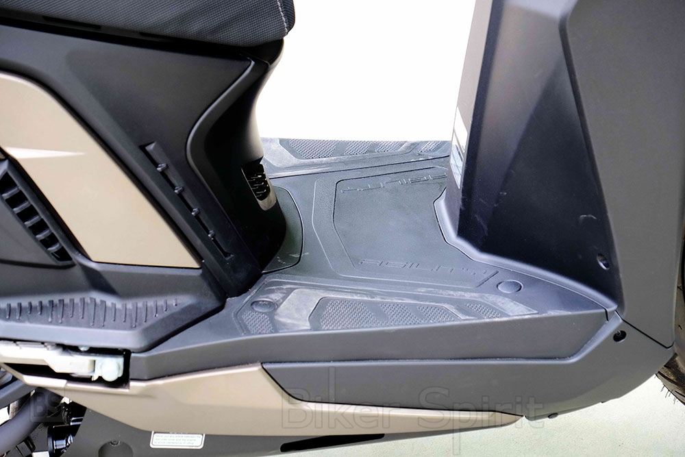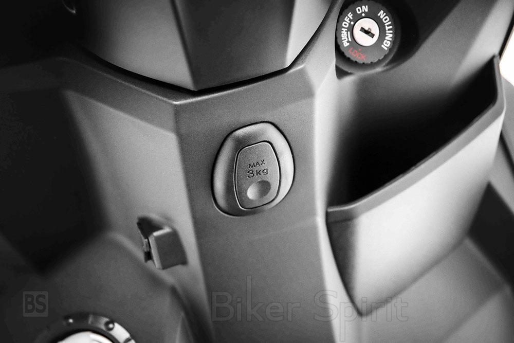 Ο χώρος κάτω από τη σέλα είναι ευρύχωρος και πολύ χρηστικός, χάρη στην ύπαρξη δύο αφαιρούμενων διαχωριστικών πάνελ και πρίζας παροχής ρεύματος12V, ενώ κάλλιστα μπορεί να φιλοξενήσει και ένα κράνος τύπου Jet. Πέραν του απόλυτα επίπεδου πατώματος, η χρηστικότητα αυξάνεται κατακόρυφα μέσω μίας ακόμα παροχής ρεύματος σε μορφή θύρας USB πάνω στην ποδιά, με την τοποθέτηση της τάπας του δοχείου καυσίμου κάτω από το τιμόνι (άρα δεν απαιτείται άνοιγμα της σέλας), με την ύπαρξη γάντζου ανάρτησης αντικειμένων, όπως επίσης και μιας θήκης για μικροαντικείμενα στη δεξιά πλευρά της ποδιάς.