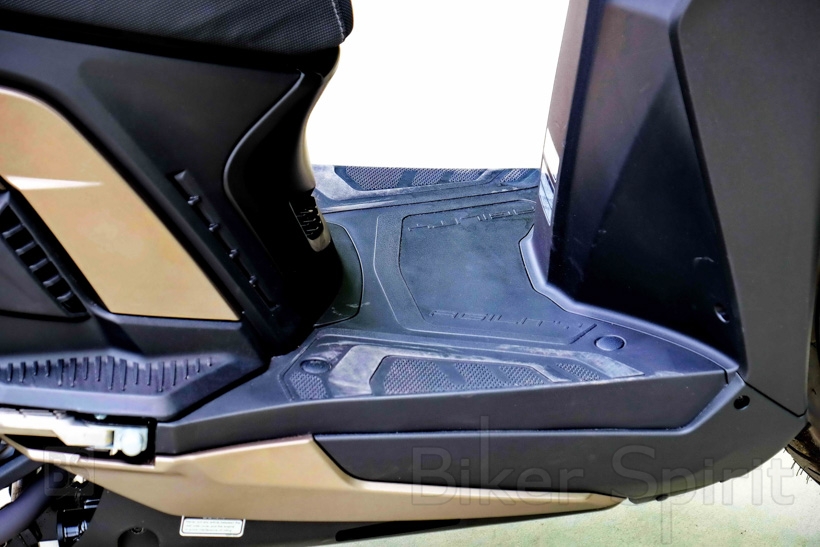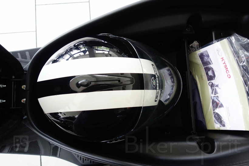 Ο χώρος κάτω από τη σέλα είναι ευρύχωρος και πολύ χρηστικός, ενώ κάλλιστα μπορεί να φιλοξενήσει ένα full face κράνος μαζί με άλλα αντικείμενα. Πέραν του απόλυτα επίπεδου πατώματος, η χρηστικότητα αυξάνεται κατακόρυφα μέσω μίας παροχής ρεύματος USB στην ποδιά, την τοποθέτηση της τάπας του δοχείου καυσίμου κάτω από το τιμόνι (άρα δεν απαιτείται άνοιγμα της σέλας) αλλά και με την ύπαρξη γάντζου ανάρτησης αντικειμένων, όπως επίσης και μιας θήκης για μικροαντικείμενα στη δεξιά πλευρά της ποδιάς.