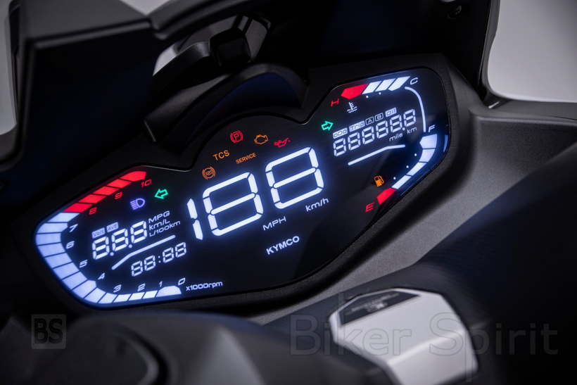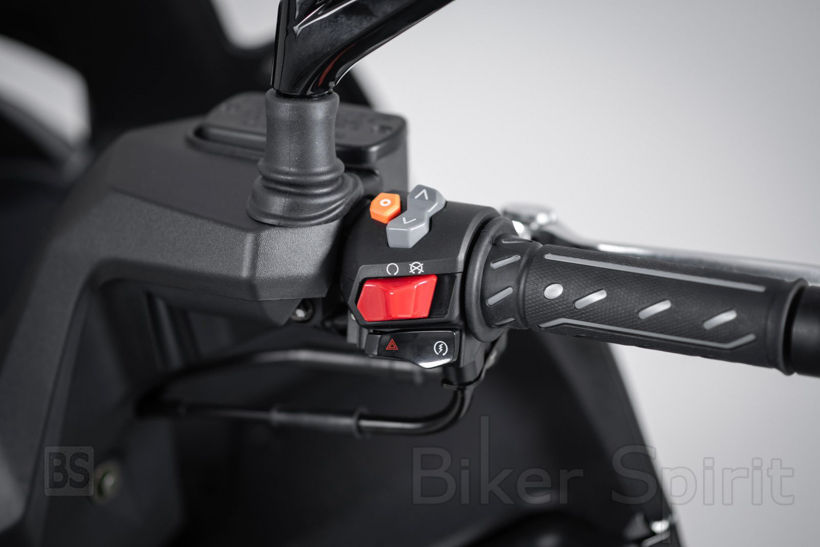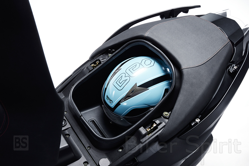 Ο χώρος κάτω από τη σέλα είναι φωτιζόμενος και μπορεί να φιλοξενήσει ένα full face κράνος και κάποια ακόμη μικροπράγματα. Στο αριστερό ντουλαπάκι κάτω από το τιμόνι υπάρχει θύρα USB 12V για τη φόρτιση ηλεκτρονικών συσκευών. Στην αριστερή πλευρά του τιμονιού υπάρχει και χειρόφρενο, κάτι εξαιρετικά χρήσιμο όταν παρκάρουμε σε εδάφη με μεγάλη κλίση, ενώ στη δεξιά πλευρά βρίσκεται ένα μπουτόν που ενεργοποιεί όλα τα φλας μαζί (alarm). O συνεπιβάτης θα αισθανθεί άνετα από την πρώτη στιγμή, με τη σέλα που του αναλογεί να προσφέρει άνεση και τις χειρολαβές με τα ανακλινόμενα μαρσπιέ να τον γεμίζουν αυτοπεποίθηση σε κάθε διαδρομή, μέσα ή και έξω από την πόλη.
