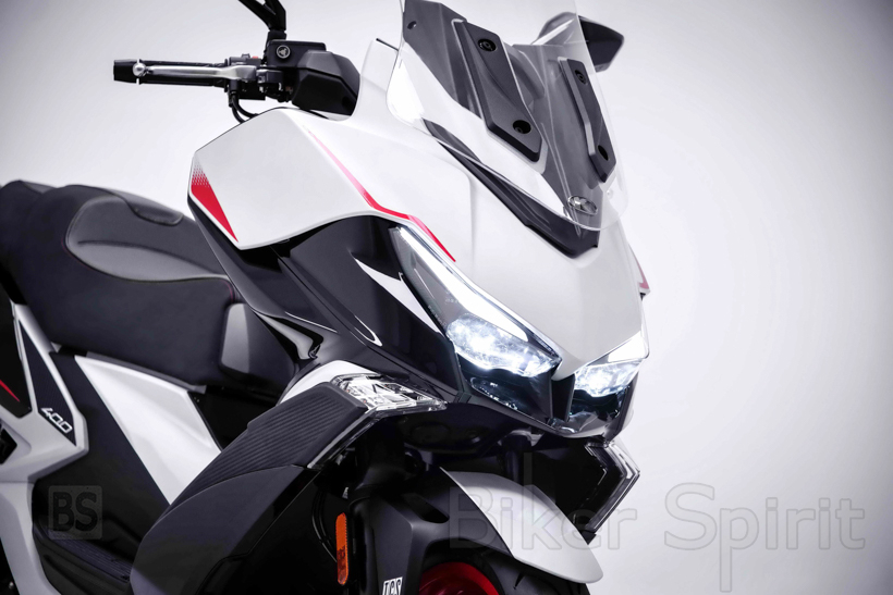 Το VS 400 καταδεικνύει στο έπακρο τη φιλοσοφία “Power Simplicity” της σειράς Xciting. Η σχεδίαση στο εμπρός τμήμα έχει προβολείς LED-DRL και μελετημένα αεροδυναμικά πλαστικά και αεραγωγούς, εντείνoντας περαιτέρω την επιθετική και δυναμική σχεδιαστική προσέγγιση του μοντέλου. Κατά γενική ομολογία, οι γραμμές του VS 400 περισσότερο θυμίζουν μια σύγχρονη supersport μοτοσυκλέτα παρά ένα megascooter με sport καταβολές. Η σέλα στοχεύει αφενός στην άνεση των επιβατών και αφετέρου στην ιδανική θέση οδήγησης. Η ζελατίνα του φέρινγκ ρυθμίζεται σε ύψος (5 θέσεις) εύκολα και χωρίς τη χρήση κάποιου εργαλείου. Είναι αυτή που εγγυάται βελτιωμένη αεροδυναμική προστασία και χαμηλότερη κατανάλωση λόγω καλύτερου αεροδυναμικού συντελεστή (Cd). Τέλος, η εργονομία χτυπάει κόκκινο μέσα από μια έγχρωμη οθόνη υψηλής ευκρίνειας με πλήρεις ενδείξεις και ένα σύστημα ανάφλεξης και ελέγχου λειτουργιών χωρίς κλειδί (Keyless).
