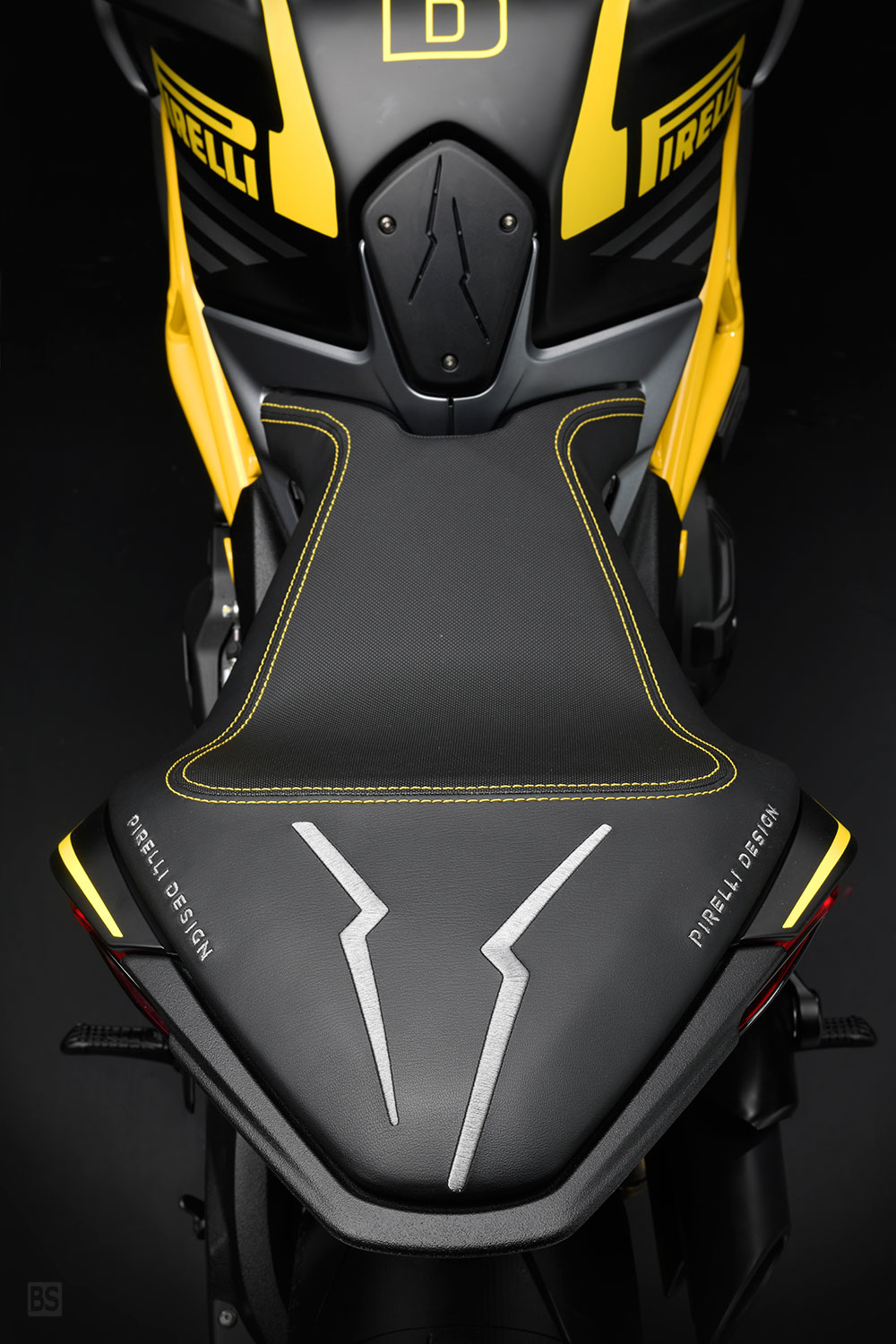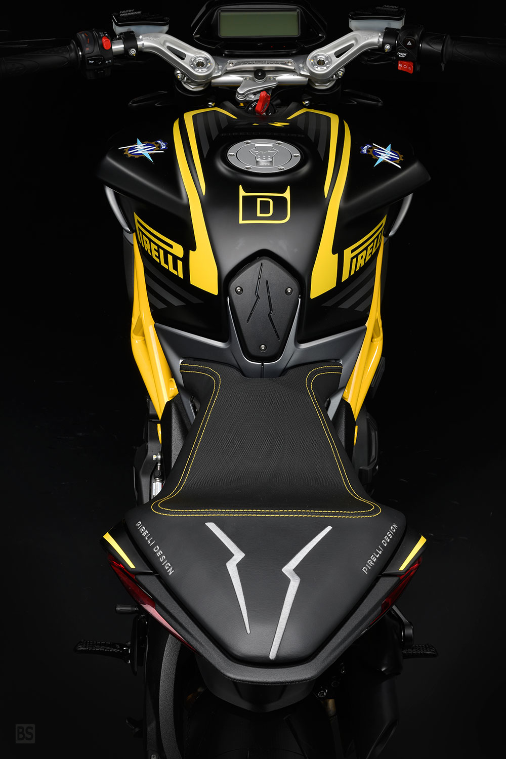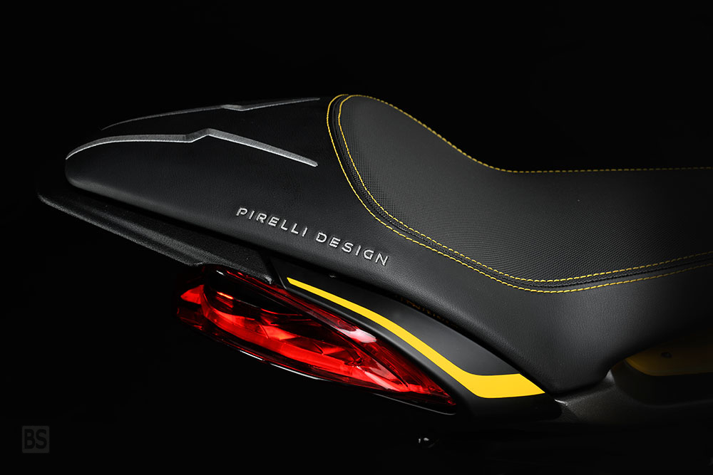 Η σέλα δημιουργήθηκε από το ερευνητικό κέντρο Castiglioni για να κάνει αυτή τη δημιουργία ακόμα πιο αποκλειστική. Ξεχωρίζει για τη διπλή της υφή με αντιπαραβαλλόμενες ραφές και για το ξεχωριστό “φλας” του DIABLO ™ κεντημένο για να διακοσμεί την ουραία μονάδα που υπογράφει η Pirelli Design. Ιδιαίτερα εξευγενισμένο είναι και το φινίρισμα των ακροδεκτών σιγαστήρα εξάτμισης, που επιτυγχάνεται με την εφαρμογή ειδικής κεραμικής βάσης, ανθεκτικής σε πολύ υψηλές θερμοκρασίες.