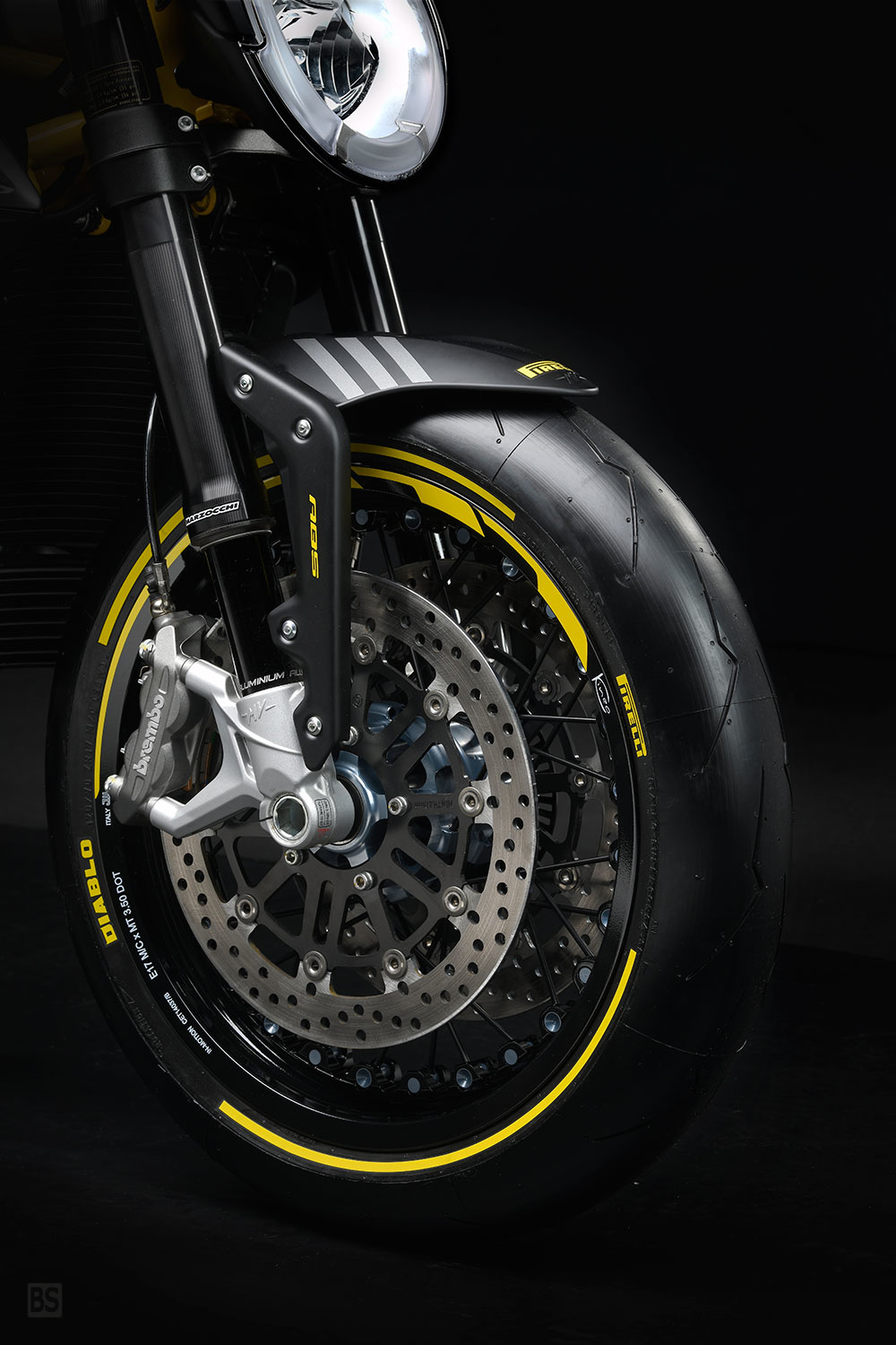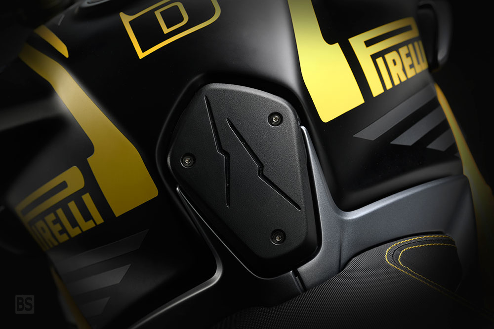 Στην πραγματικότητα, η μικρή εμπρός μάσκα πάνω από το φανάρι και το ντεπόζιτο κατασκευάζονται από καουτσούκ ειδικά διαμορφωμένο από το τμήμα έρευνας και ανάπτυξης της Pirelli για να εξασφαλίσει υψηλή αντοχή στις γρατζουνιές και το τρίψιμο στα οποία υπόκεινται αυτά τα αντικείμενα, καθώς και στους ατμοσφαιρικούς και χημικούς παράγοντες, όπως το καύσιμο. Και τα δύο εξαρτήματα έχουν το σύμβολο “φλας” που διακρίνει τα ελαστικά της σειράς DIABLO ™, συμπεριλαμβανομένου του DIABLO ™ Supercorsa SP που εξοπλίζει αυτό το μοντέλο με εμπρός 120/70 ZR17 και πίσω 200/55 ZR17 με ζάντα 6 ” .