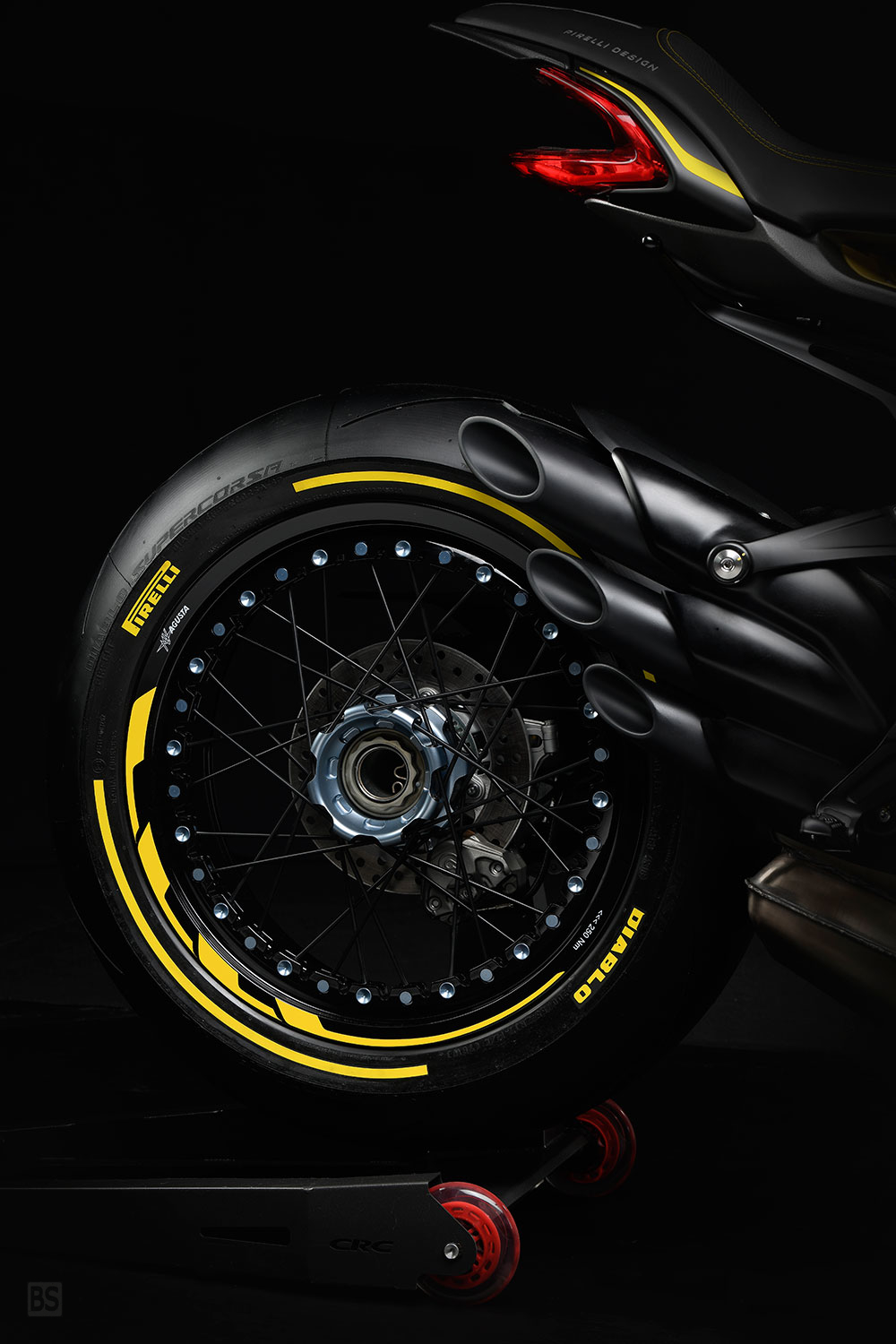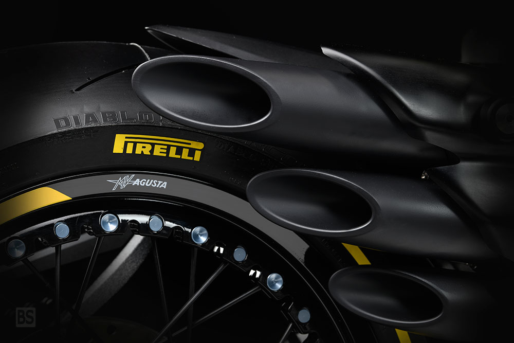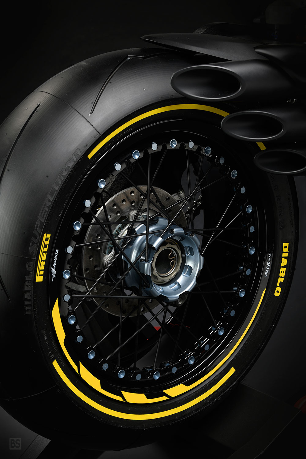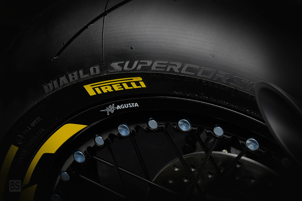 Για να αναγνωριστεί ξεκάθαρα η μοτοσυκλέτα ως αποτέλεσμα της συνεργασίας μεταξύ της MV Agusta και της Pirelli, είναι δυνατή η αγορά, με αποκλειστική επιλογή, των ελαστικών DIABLO ™ Supercorsa SP με έγχρωμες πλευρές αντίστοιχα με κίτρινες ή μπλε λωρίδες, ανάλογα με την έκδοση στην οποία Συνδυάζονται.