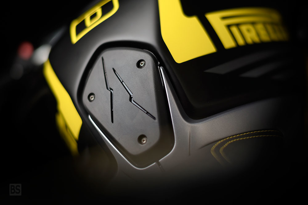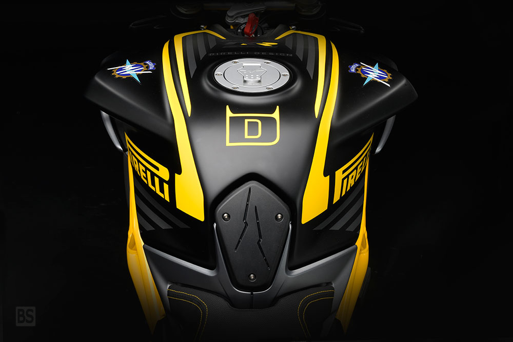 Ένα κίτρινο λογότυπο είναι επίσης για το εμπορικό σήμα Pirelli στις πλευρές του ντεπόζιτου, καθώς και για το λογότυπο DIABLO ™, το οποίο προσδιορίζει την γκάμα των ελαστικών Pirelli υψηλής απόδοσης. Το δεύτερο χρώμα επικεντρώνεται σε μια γυαλιστερή λευκή βάση με μπλε ένθετα.