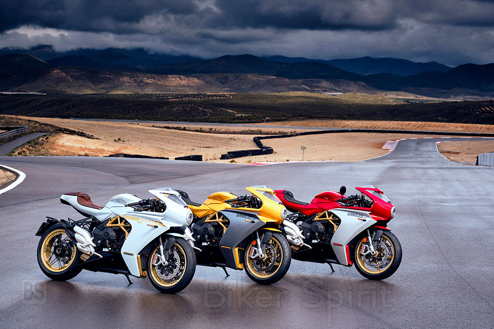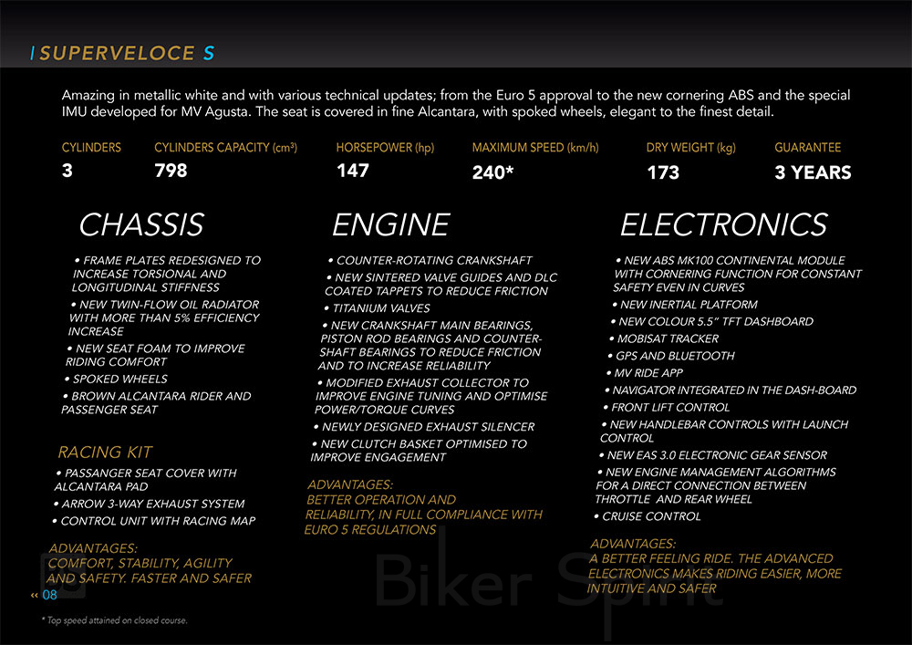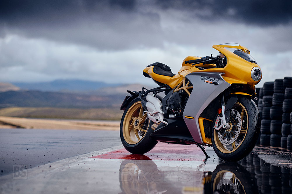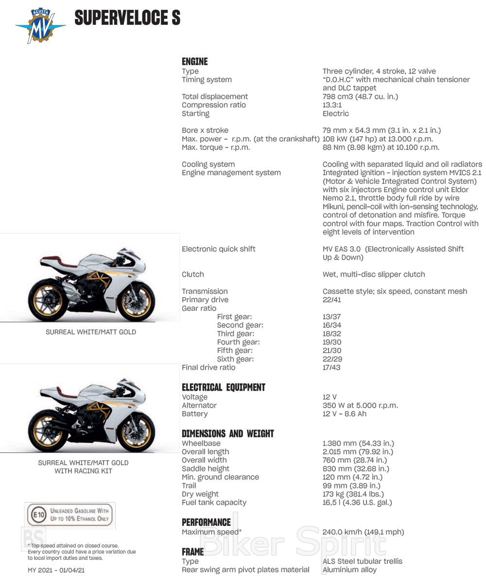 Μαζί με το κανονικό Superveloce που διατίθεται σε χρώματα Ago RED / Ago Silver και Pear Metallic Yellow / Matt Metallic Graphite – η MV Agusta παρουσίασε επίσης το νέο Superveloce S σε έναν μοναδικό συνδυασμό λευκού χρώματος με χρυσούς τόνους.