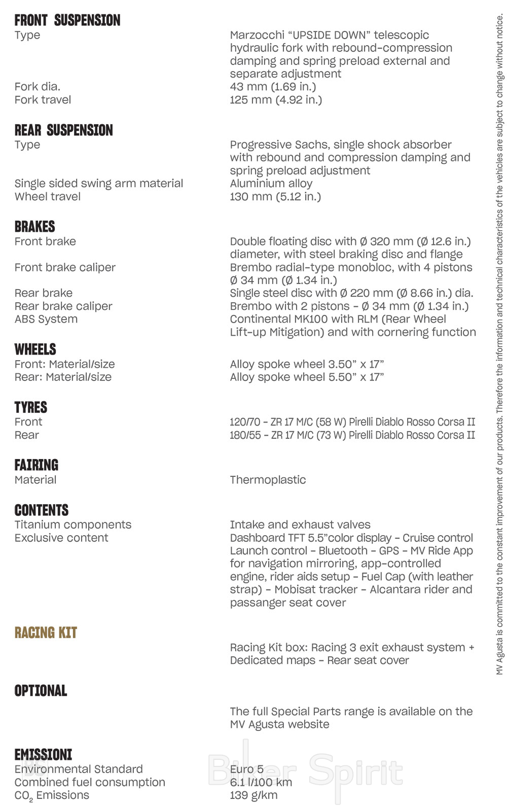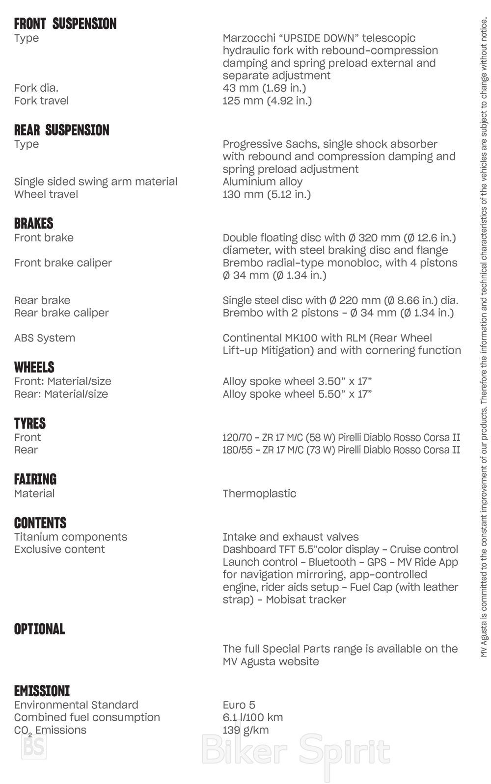 Το ABS, που αναπτύχθηκε από την Continental – μονάδα ελέγχου MK100 – με συγκεκριμένες εκχωρήσεις για την MV Agusta, είναι εξοπλισμένο με τη λειτουργία περιστροφής και ο έλεγχος πρόσφυσης μπορεί να παρέμβει με μεγαλύτερη ακρίβεια ανάλογα με την κατάσταση – θέσης της μοτοσυκλέτας.