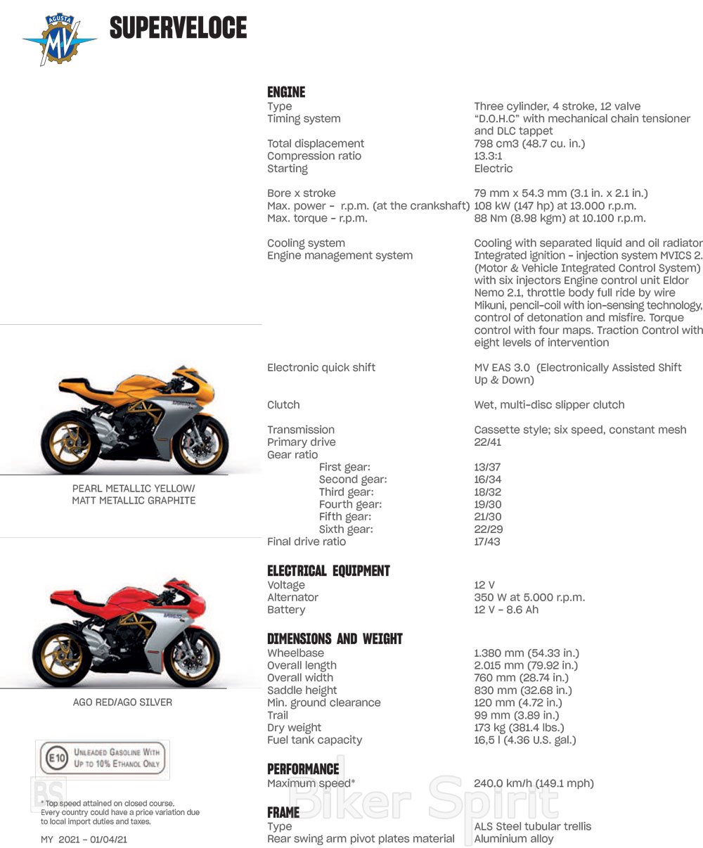 Το Superveloce ανανεώνεται για το 2021 εισάγοντας έναν κινητήρα προσαρμοσμένο στους κανονισμούς Euro5, εκτός από τη βελτίωση του εξοπλισμού των ηλεκτρονικών βοηθημάτων. και την εισαγωγή μιας αποκλειστικής έκδοσης S.