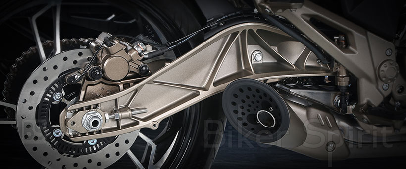 Το ψαλίδι είναι ασύμμετρο κατασκευασμένο από χυτό αλουμίνιο, υιοθετώντας ένα σχήμα “τόξου” στη δεξιά πλευρά προσφέροντας χώρο στο κοντό τελικό της εξάτμισης. Λόγω του ειδικού κράματος αλουμινίου επιτυγχάνεται μείωση του βάρους του ψαλιδιού, παράλληλα με υψηλότερη στρεπτική ακαμψία και εξαιρετική σταθερότητα.
