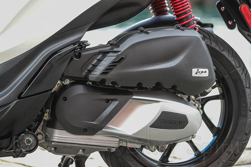 Ο νέος μονοκύλινδρος 125cc i-get παρέχει μέγιστη ισχύ 11 kW στις 9.000 σ.α.λ., ενώ ο πιο δυνατός 150 cc φτάνει τα 12.1 kW στις 8.750 σ.α.λ. Τιμές αναφοράς που τοποθετούν το νέο Piaggio Medley μεταξύ των ισχυρότερων στην κατηγορία μεσαίων σκούτερ με μεγάλους τροχούς και που στον δρόμο μεταφράζονται σε ζωηρούς κινητήρες, ειδικά σχεδιασμένους για καθημερινή χρήση σε αστικό περιβάλλον, δηλαδή σε κυκλοφοριακές συνθήκες που χαρακτηρίζονται από συνεχείς στάσεις και απαιτούν ελαστικότητα, ρεπρίζ και ομαλή λειτουργία. Τα χαρακτηριστικά αυτά εξασφαλίζονται από τις εξαιρετικές τιμές ροπής (12 Nm στις 6500 σ.α.λ. για τα 125cc και 15 Nm στις 6500 σ.α.λ. για τα 150 cc) που επιτρέπουν στο Medley εξαιρετική επιτάχυνση από στάση και ρεπρίζ, χάρη και στο πολύ χαμηλό συνολικό βάρος.Αυτά τα αποτελέσματα αποκτήθηκαν μέσω της σχολαστικής εργασίας των τεχνικών της Piaggio στα περισσότερα εξαρτήματα. Ο κύριος στόχος ήταν η βελτιστοποίηση της θερμοδυναμικής απόδοσης, η μείωση των τριβών και του θορύβου λειτουργίας του κινητήρα, αυξάνοντας παράλληλα τις επιδόσεις. Η κυλινδροκεφαλή γεννήθηκε από ένα εντελώς νέο έμβολο και χαρακτηρίζεται από μεγαλύτερους αγωγούς και βαλβίδες για την αύξηση του συντελεστή ροής και συνεπώς την απόδοση του κινητήρα. Το σύστημα διανομής διαθέτει νέους ελαφρύτερους βραχίονες, ενώ το προφίλ του εκκεντροφόρου έχει επανασχεδιαστεί για να επιτυγχάνεται ακριβής έλεγχος του βυθίσματος των βαλβίδων που συμβάλλουν στη βελτιστοποίηση της απόδοσης της καύσης. Ο στόχος του συνδυασμού της αύξησης της μέγιστης ισχύος με τη διατήρηση των μέγιστων τιμών ροπής και της ελαστικότητας λειτουργίας που είναι χαρακτηριστικό της οικογένειας κινητήρων i-get έχει επιτευχθεί μέσω πολλαπλών παρεμβάσεων: νέο εμβόλο με αναθεωρημένη γεωμετρία της κεφαλής του, νέο μπεκ, νέο σώμα πεταλούδας με διάμετρο αυξημένη κατά 2 χιλ. και εντελώς νέο φιλτροκούτι, εξοπλισμένο με ένα ειδικό αντηχείο Helmholtz, τοποθετημένο στον αυλό εισαγωγής. Νέα είναι και η εξάτμιση, τόσο από την άποψη της αισθητικής όσο και των διαστάσεων: ο επιπλέον όγκος επέτρεψε την επίτευξη πιο αθόρυβης λειτουργίας σε συνδυασμό με καλύτερο ήχο και χαμηλότερες πτώσεις πίεσης, όλα προς όφελος της μέγιστης απόδοσης του κινητήρα. Όλα αυτά συνδυάζονται με μια μετάδοση CVT, της οποίας η βαθμονόμηση έχει βελτιστοποιηθεί ώστε να εκμεταλλεύεται, σε όλες τις συνθήκες οδήγησης, τη νέα καμπύλη ισχύος.