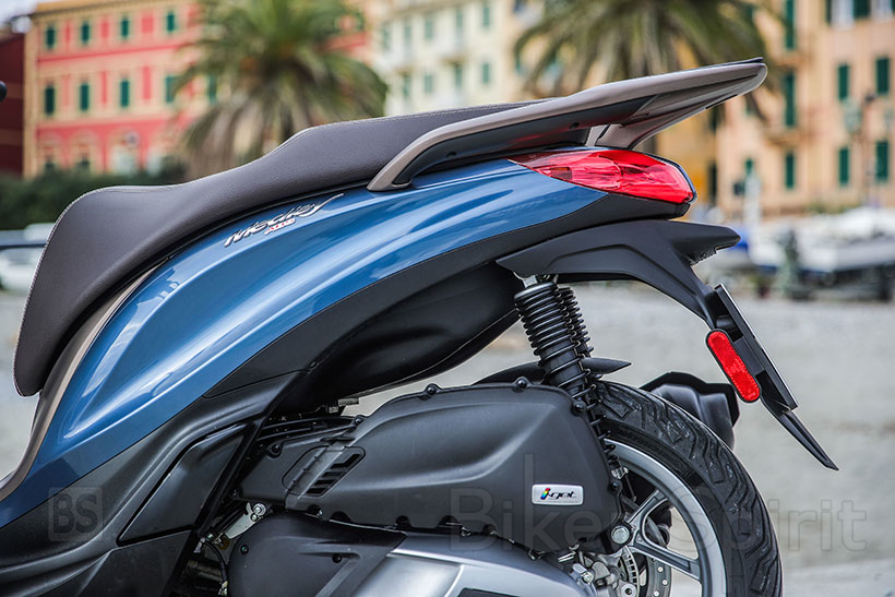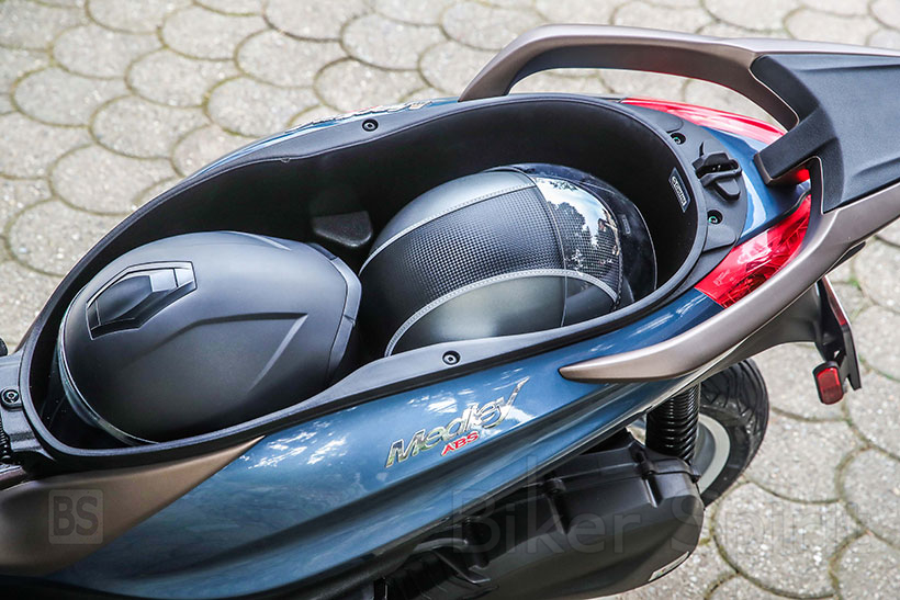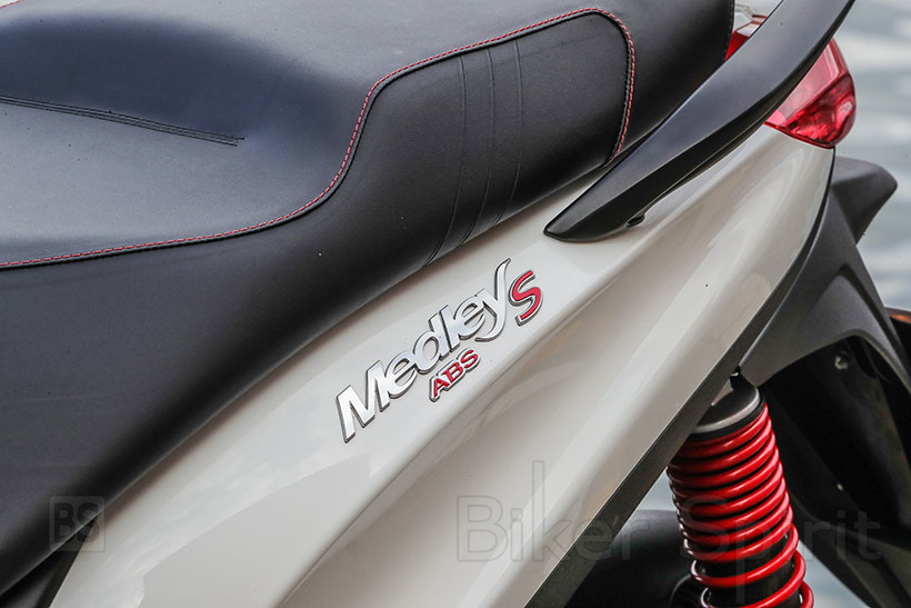 H εναλλαγή κοίλων και κυρτών επιφανειών σε όλο το σώμα του Medley, καθοδηγούμενη από ισχυρές και τοξωτές γραμμές, καθιστά την εμφάνιση του οχήματος δυναμική και συμπαγή ταυτόχρονα. Το ιδιαίτερα κομψό πίσω μέρος διατηρεί τις συμπαγείς διαστάσεις του οχήματος, παρά τον απίστευτα μεγάλο αποθηκευτικό χώρο, πάνω από 36 λίτρα, ικανός να φιλοξενήσει δύο full-face κράνη, θεαματική επίδοση για σκούτερ με μεγάλους τροχούς. Αυτό επιτυγχάνεται χάρη στον σωστό σχεδιασμό της ουράς του οχήματος, καθώς και στη θέση του ρεζερβουάρ καυσίμου στο κέντρο του υποπόδιου. Πρόκειται για μία επιλογή που συνέβαλε στην αύξηση της ικανότητας μεταφοράς φορτίου στον χώρο κάτω από τη σέλα, προσφέροντας επιπλέον πλεονεκτήματα όπως τη δυνατότητα ανεφοδιασμού χωρίς αποβίβαση και καλύτερη οδηγησιμότητα λόγω της βελτιωμένης κατανομής του βάρους, το οποίο έχει πλέον μεταφερθεί πιο κεντρικά.