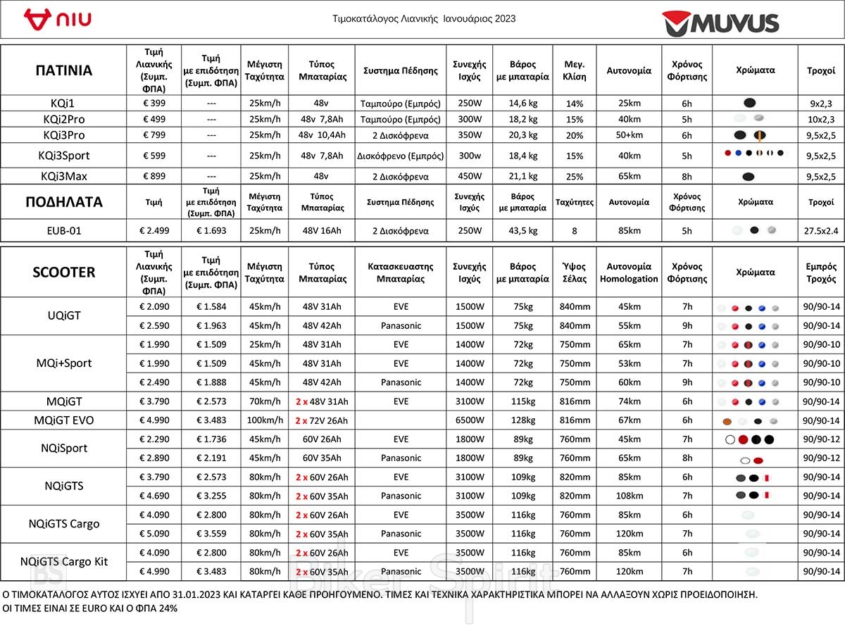 Η Muvus, αποκλειστικός αντιπρόσωπος της NIU για Ελλάδα και Κύπρο, ανακοινώνει τον νέο Τιμοκατάλογος της NIU, ο οποίος περιλαμβάνει και τις τιμές που προκύπτουν με την χρήση της επιδότησης του προγράμματος «Κινούμαι Ηλεκτρικά».