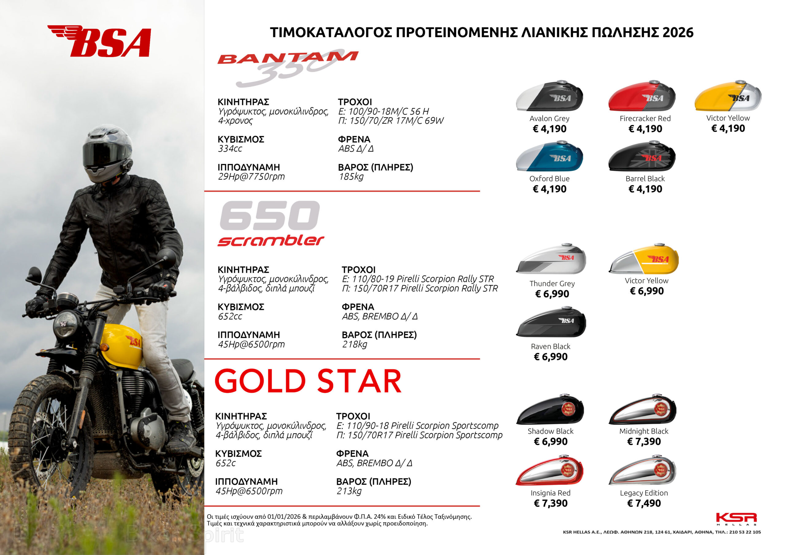 ΤΙΜΟΚΑΤΑΛΟΓΟΙ 2026 Νέος Τιμοκατάλογος BSA Motorcycles 2026 26 December 2025 BikerSpirit BSA Motorcycles, Νέος Τιμοκατάλογος, Τιμοκατάλογος 0 min read Η KSR Hellas S.A ανακοίνωσε την έναρξη αντιπροσώπευσης της νέας μάρκας BSA καθώς και τον Τιμοκατάλογο Προτεινόμενης Λιανικής για τα νέα της μοντέλα Bantam 350, Scrambler 650 και το εμβληματικού μοντέλου Gold Star 650. Randomizer Related Posts Νέος τιμοκατάλογος μοτοσυκλετών Triumph 2026 Νέος τιμοκατάλογος Ducati 2026 Νέος Τιμοκατάλογος μοτοσυκλετών YAMAHA 2026 Νέος τιμοκατάλογος Suzuki Motorcycles 2026 Νέος Τιμοκατάλογος Harley-Davidson 2026 Νέος Tιμοκατάλογος Μοτοσυκλετών VOGE 2026 Share this: Share on Facebook (Opens in new window) Facebook Share on X (Opens in new window) X Share on LinkedIn (Opens in new window) LinkedIn Print (Opens in new window) Print More Share on Reddit (Opens in new window) Reddit Share on Tumblr (Opens in new window) Tumblr Share on Pinterest (Opens in new window) Pinterest Related