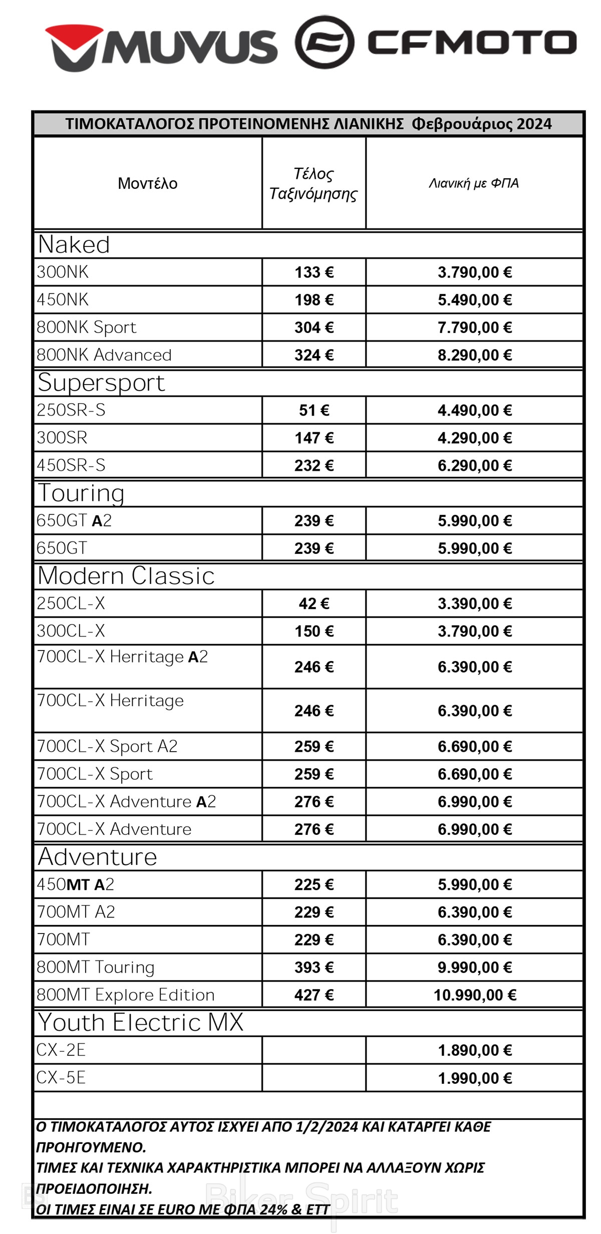 ΤΙΜΟΚΑΤΑΛΟΓΟΙ 2024 Νέος Τιμοκατάλογος CFMOTO Μοτοσυκλετών 2024 1 February 2024 BikerSpirit CFMOTO, Τιμοκατάλογος 0 min read H CFMOTO HELLAS ανακοινώνει το Νέο Τιμοκατάλογο Προτεινόμενης Λιανικής για τις μοτοσυκλέτες CFMOTO ο οποίος θα ισχύσει από 1/2/2024. 450SR-S Zircon Black 450SR-S Tundra Grey CX-5E CX-2E Randomizer Related Posts Νέος τιμοκατάλογος της Honda Motorcycles 2024 Νέος τιμοκατάλογος GASGAS MY25 Νέος τιμοκατάλογος Suzuki Motorcycles 2024 Νέος Τιμοκατάλογος MV AGUSTA 2024 Νέος Τιμοκατάλογος Peugeot Motocycles για το 2024 Νέος τιμοκατάλογος μοτοσυκλετών Triumph 2024 Share this: Share on Facebook (Opens in new window) Facebook Share on X (Opens in new window) X Share on LinkedIn (Opens in new window) LinkedIn Print (Opens in new window) Print More Share on Reddit (Opens in new window) Reddit Share on Tumblr (Opens in new window) Tumblr Share on Pinterest (Opens in new window) Pinterest Related