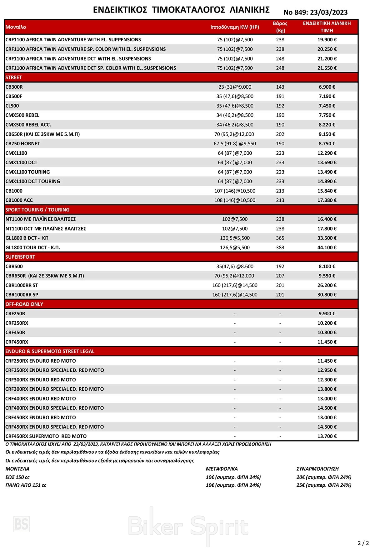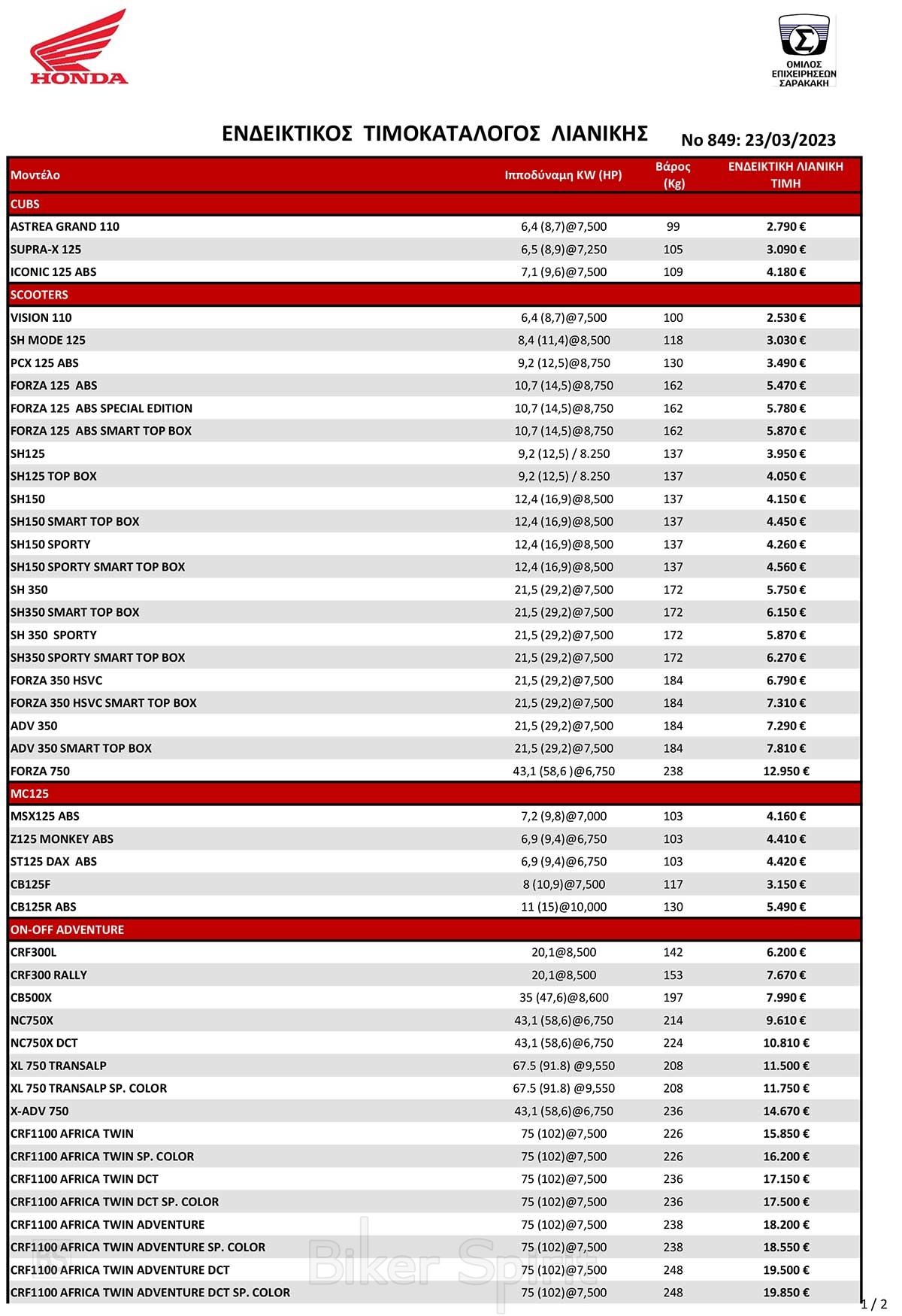 ΝΕΟΣ ΤΙΜΟΚΑΤΑΛΟΓΟΣ ΛΙΑΝΙΚΗΣ Honda Motorcycles που τίθεται σε ισχύ από 23/03/2023.