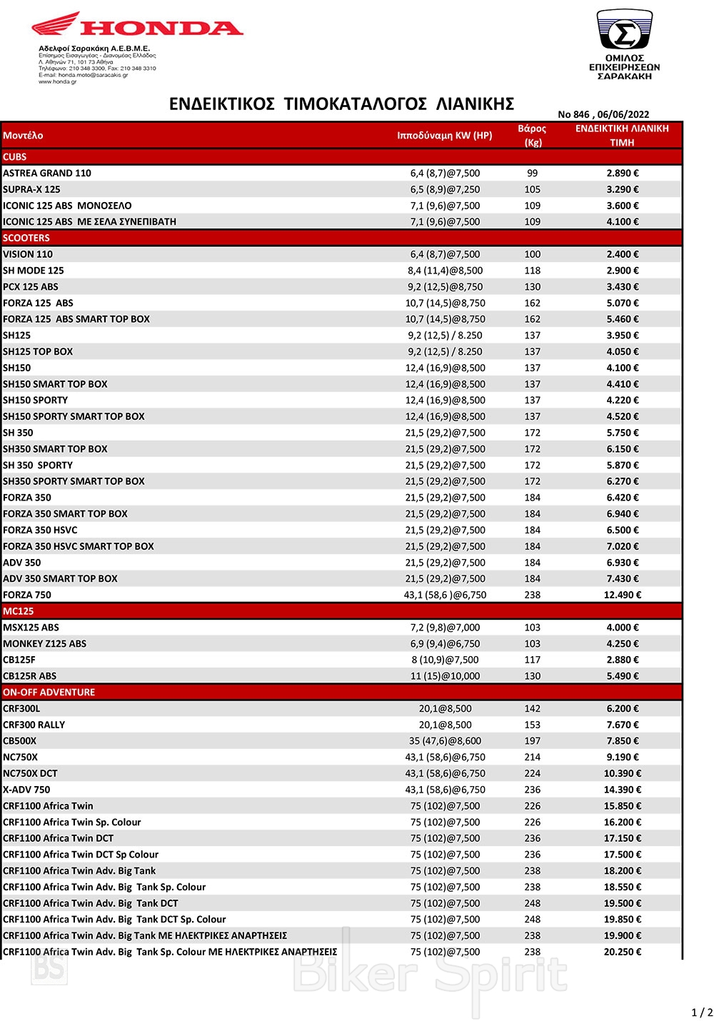 Honda, Αδελφοί Σαρακάκη, Νέος Τιμοκατάλογος, ΤΙΜΟΚΑΤΑΛΟΓΟΙ 2022, Τιμοκατάλογος 0 min read
