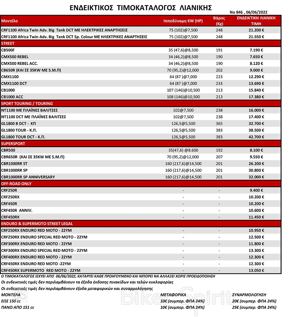 Νέος Τιμοκατάλογος Honda Μοτοσυκλετών 2022