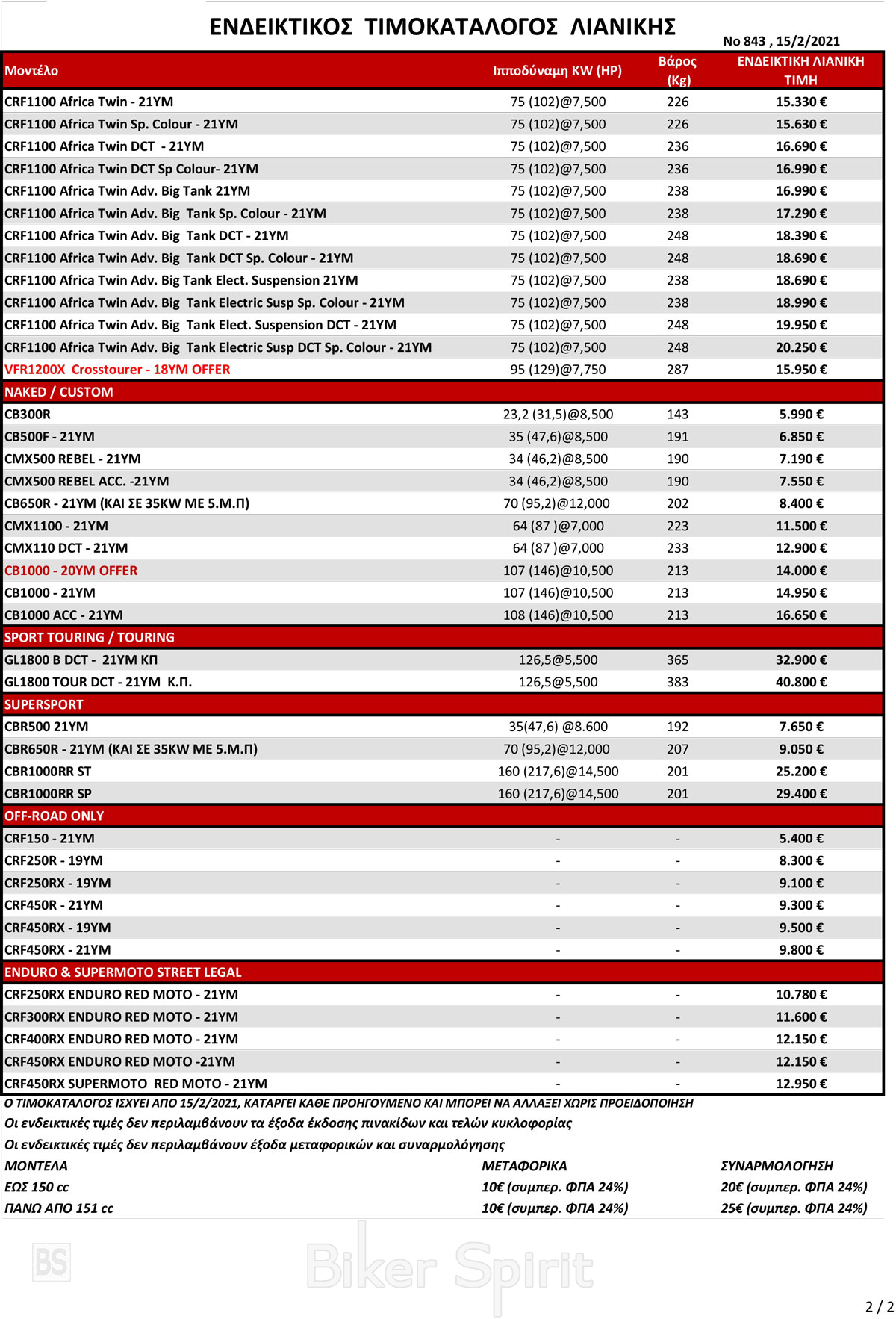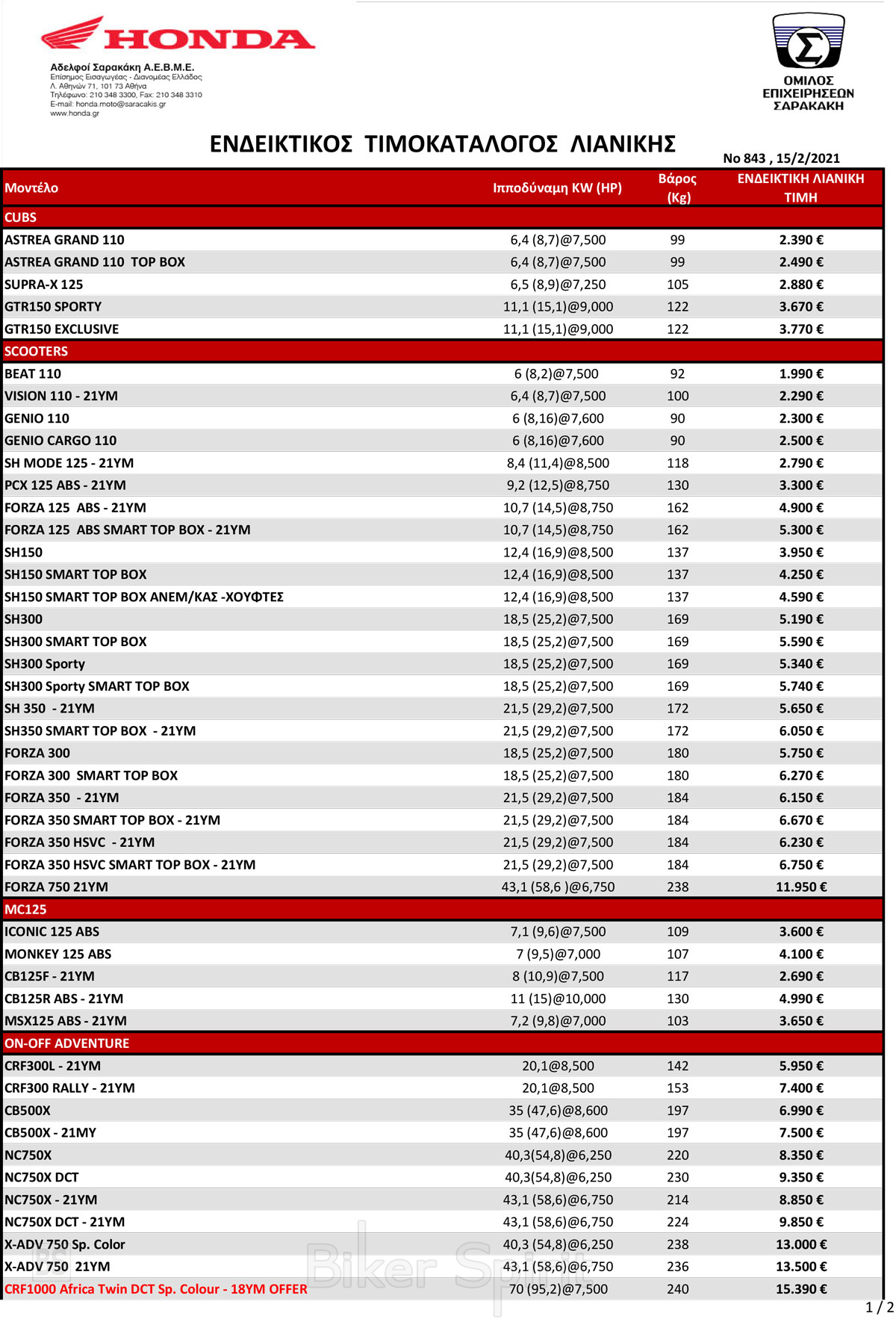 Η Honda Σαρακάκης ενημερώνει για το Νέο Τιμοκατάλογο που τίθεται σε ισχύ από 15 Φεβρουαρίου 2021 και έχει προστεθεί το μοντέλο CBR500.