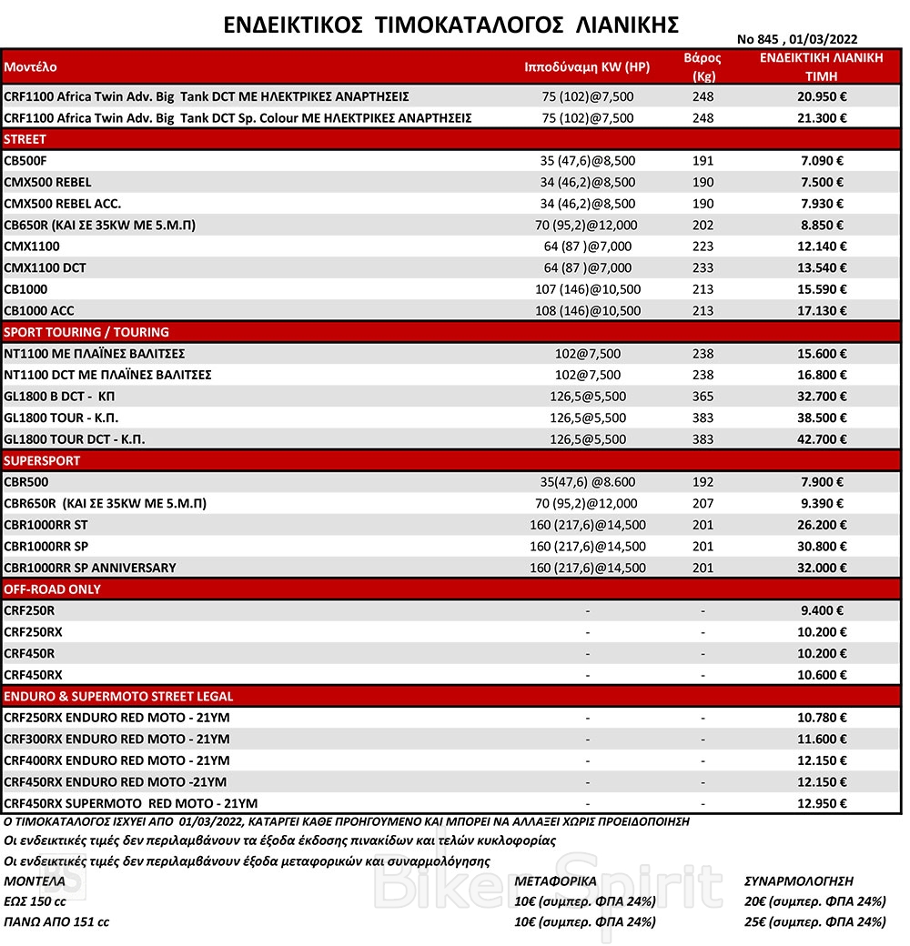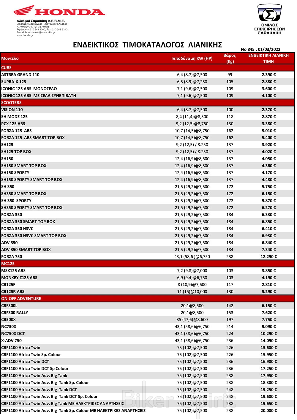 Νέος Τιμοκατάλογος Honda Μοτοσυκλετών 2022