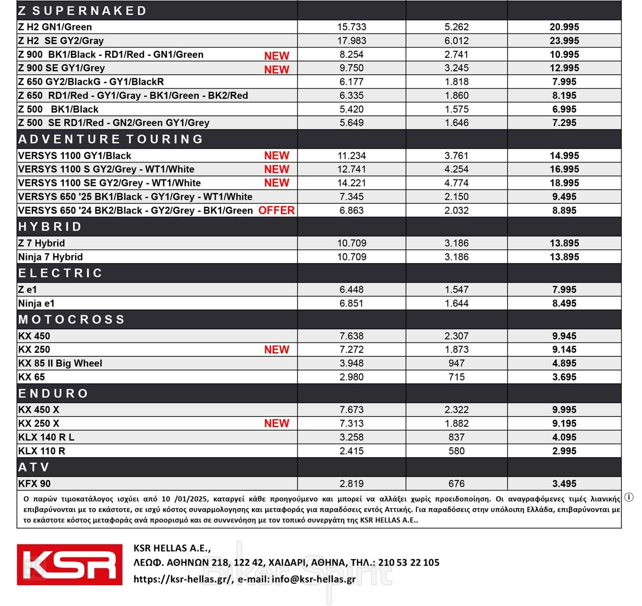 H KSR Hellas, αποκλειστικός αντιπρόσωπος της Kawasaki στην Ελλάδα, ανακοινώνει τον νέο προτεινόμενο τιμοκατάλογο λιανικής του έτους 2025, ο οποίος έχει άμεση ισχύ.