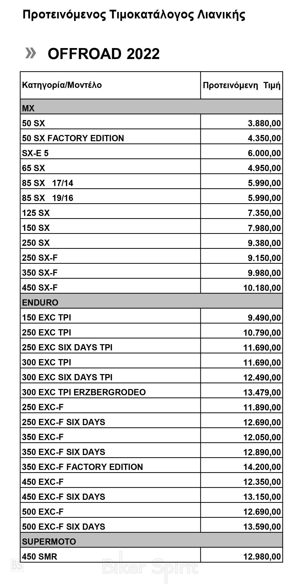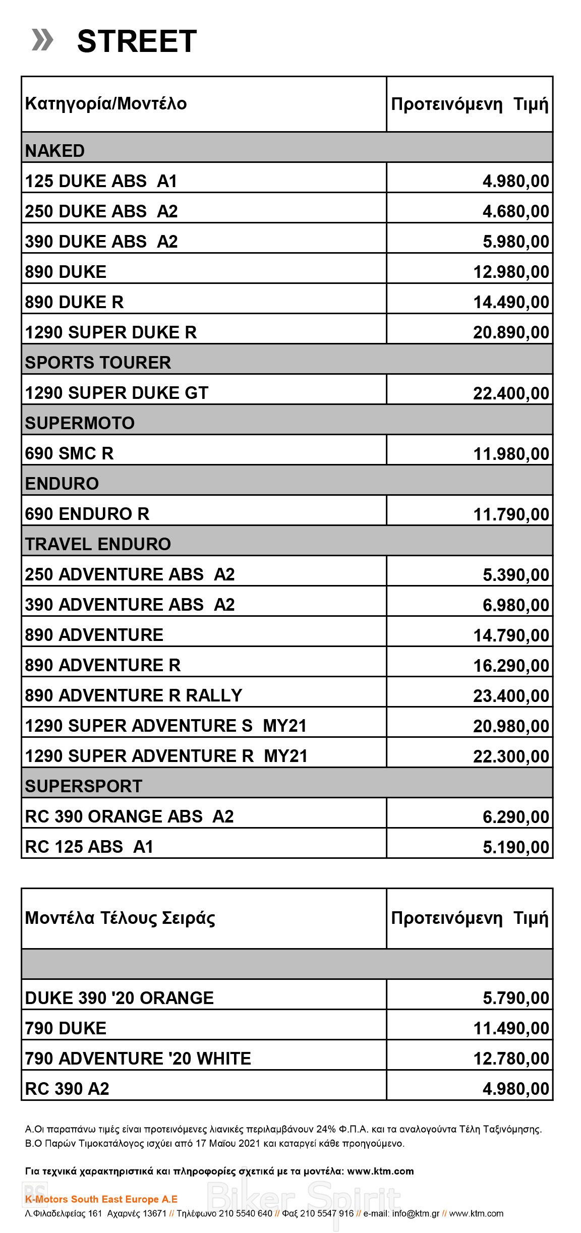 Νέος τιμοκατάλογος λιανικής της εταιρίας KTM, για το 2021 ο οποίος περιέχει όλα τα νέα μοντέλα της εταιρίας, με προσθήκη των χωμάτινων μοντέλων του 2022, καθώς και τις ανακοινωμένες αλλαγές στις τιμές συγκεκριμένων ασφάλτινων μοντέλων.