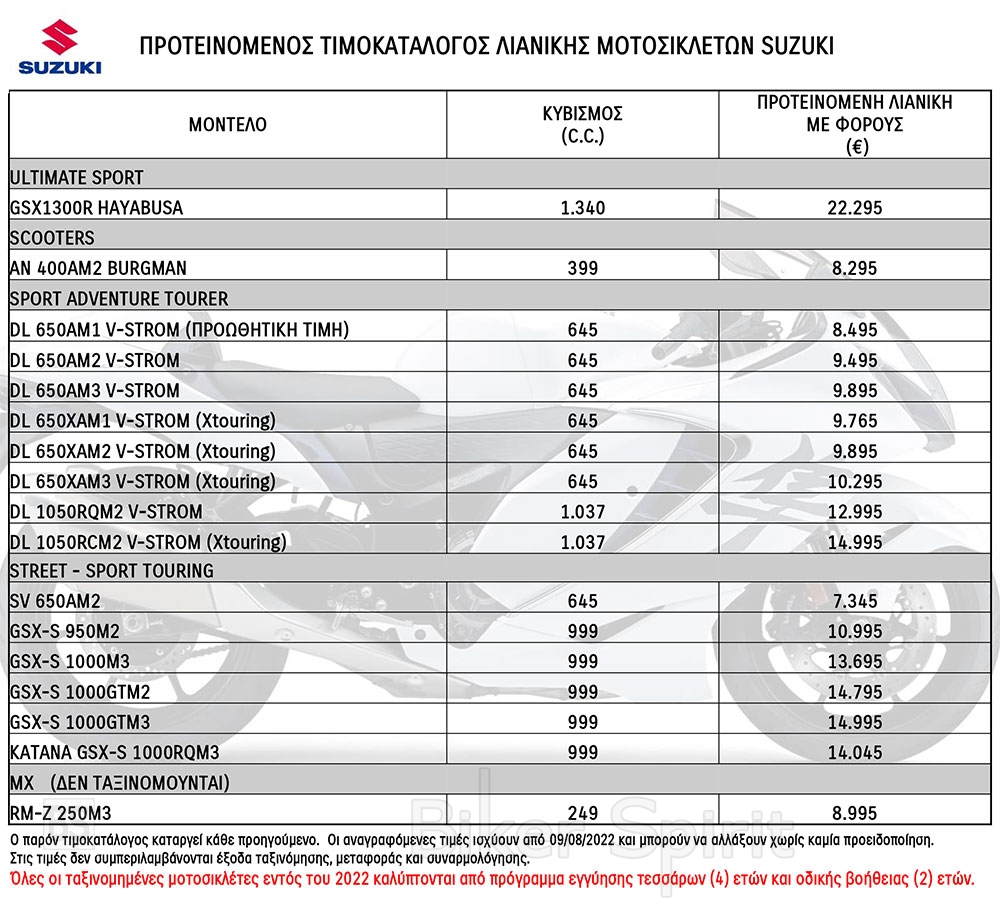 SuzukiΤΙΜΟΚΑΤΑΛΟΓΟΙ 2022 Νέος τιμοκατάλογος μοτοσικλετών SUZUKI 2022 9 August 2022 BikerSpirit Suzuki, Τιμοκατάλογος 0 min read Η SUZUKI ανακοίνωσε νέο, ενημερωμένο τιμοκατάλογο λιανικής πώλησης μοτοσικλετών SUZUKI 2022 Randomizer Related Posts Νέος τιμοκατάλογος μοτοσικλετών SUZUKI 2022 SUZUKI MOTO ΜΕ 4 ΧΡΟΝΙΑ ΕΠΕΚΤΑΣΗ ΕΓΓΥΗΣΗΣ & 2 ΧΡΟΝΙΑ ΟΔΙΚΗ ΒΟΗΘΕΙΑ Suzuki Katana 45th Anniversary: Συλλεκτική έκδοση μόνο 45 μοτοσυκλετών για τα 45 χρόνια του θρύλου Η Suzuki Moto Greece μαζί με τον Γιάννη Τρίγκα – DR-Z4S Rally Project για τη νέα αγωνιστική σεζόν Νέο Suzuki Address 125, Ανανεωμένο Avenis 125 & Burgman Street 125EX – Scooter 125cc για καθημερινή μετακίνηση στην πόλη Η πρώτη Suzuki Hayabusa Special Edition που έφτασε στην Ελλάδα, διαθέσιμη για να τη δείτε από κοντά Share this: Share on Facebook (Opens in new window) Facebook Share on X (Opens in new window) X Share on LinkedIn (Opens in new window) LinkedIn Print (Opens in new window) Print More Share on Reddit (Opens in new window) Reddit Share on Tumblr (Opens in new window) Tumblr Share on Pinterest (Opens in new window) Pinterest Related