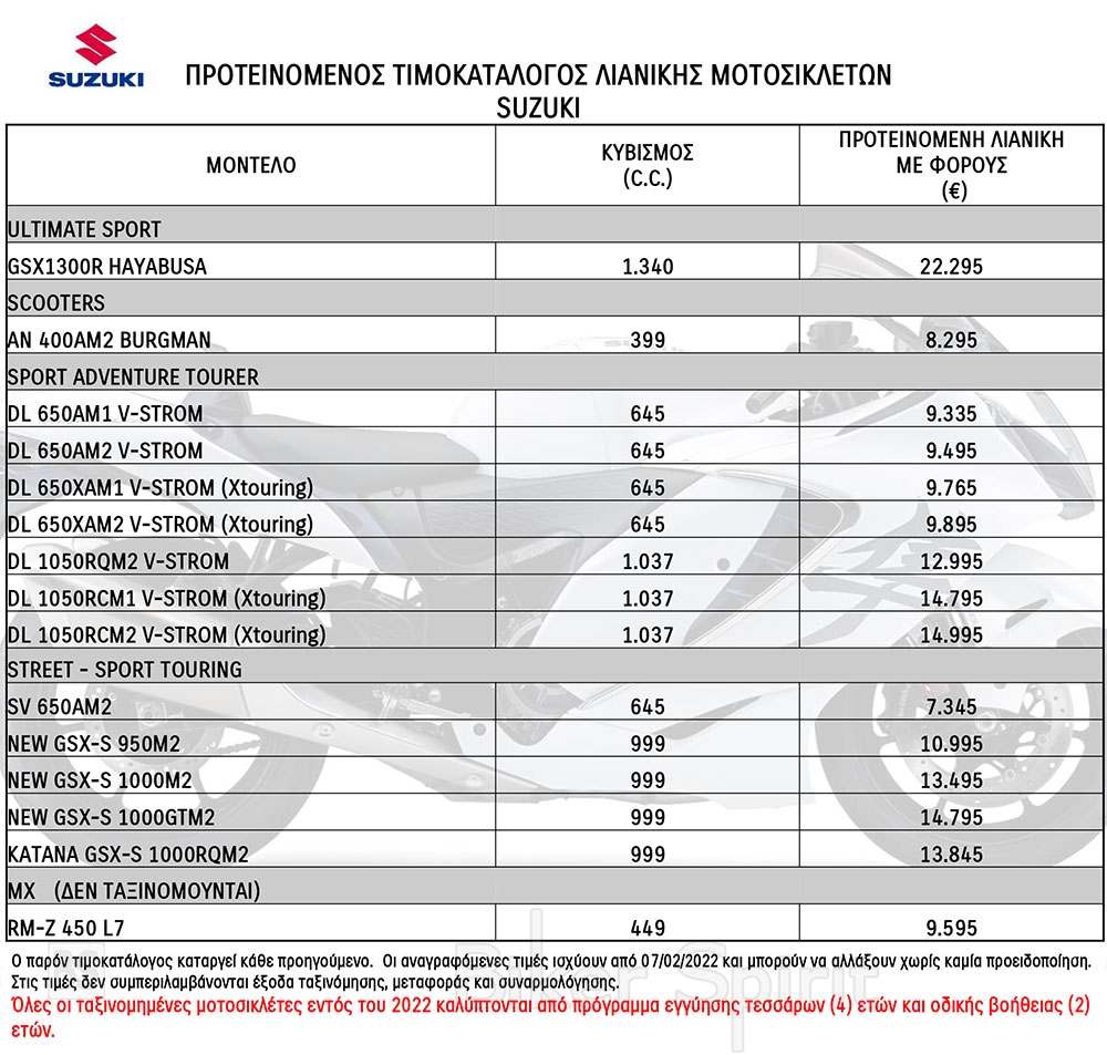 SuzukiΤΙΜΟΚΑΤΑΛΟΓΟΙ 2022 Νέος τιμοκατάλογος μοτοσικλετών SUZUKI 2022 8 February 2022 BikerSpirit Suzuki, Τιμοκατάλογος 0 min read Η SUZUKI ανακοίνωσε το νέο, τιμοκατάλογο λιανικής πώλησης μοτοσικλετών SUZUKI για το 2022 με την προσθήκη των νέων GSX-S1000 & GSX-S1000GT. Randomizer Related Posts Νέος τιμοκατάλογος μοτοσικλετών SUZUKI 2022 SUZUKI MOTO ΜΕ 4 ΧΡΟΝΙΑ ΕΠΕΚΤΑΣΗ ΕΓΓΥΗΣΗΣ & 2 ΧΡΟΝΙΑ ΟΔΙΚΗ ΒΟΗΘΕΙΑ Suzuki Katana 45th Anniversary: Συλλεκτική έκδοση μόνο 45 μοτοσυκλετών για τα 45 χρόνια του θρύλου Η Suzuki Moto Greece μαζί με τον Γιάννη Τρίγκα – DR-Z4S Rally Project για τη νέα αγωνιστική σεζόν Νέο Suzuki Address 125, Ανανεωμένο Avenis 125 & Burgman Street 125EX – Scooter 125cc για καθημερινή μετακίνηση στην πόλη Η πρώτη Suzuki Hayabusa Special Edition που έφτασε στην Ελλάδα, διαθέσιμη για να τη δείτε από κοντά Share this: Share on Facebook (Opens in new window) Facebook Share on X (Opens in new window) X Share on LinkedIn (Opens in new window) LinkedIn Print (Opens in new window) Print More Share on Reddit (Opens in new window) Reddit Share on Tumblr (Opens in new window) Tumblr Share on Pinterest (Opens in new window) Pinterest Related