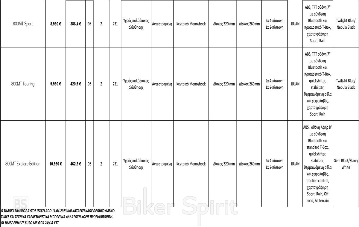 Λόγω του Adventure χαρακτήρα των 650ΜΤ και 800ΜΤ Touring υπάρχει επίσης μείωση της τιμής ως “Ανοιξιάτικη προσφορά” η οποία θα ισχύσει για περιορισμένο αριθμό μοτοσυκλετών.