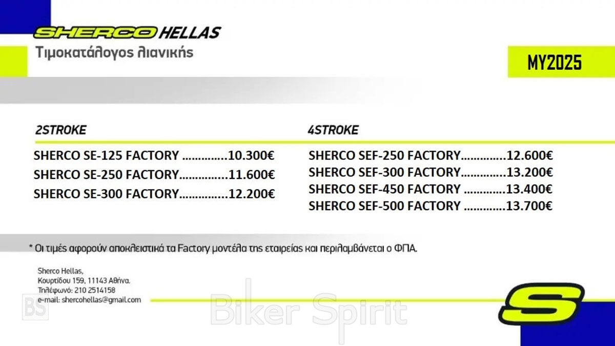 Η Sherco Hellas κυκλοφόρησε τον νέο τιμοκατάλογο των μοντέλων Factory Enduro 2025 τον οποίο μπορείτε να δείτε παρακάτω.