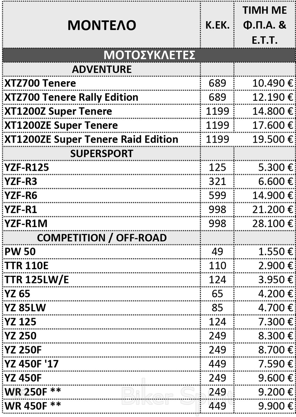 Νέος Τιμοκατάλογος μοτοσυκλετών YAMAHA 2020