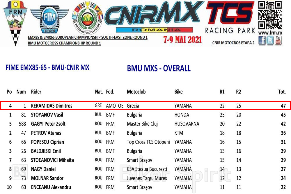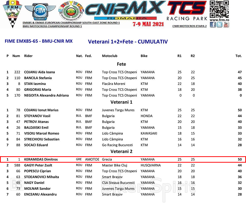 Ο Δημήτρης Κεραμιδάς κέρδισε τον αγώνα της MX Senior με μια τρίτη και μια πρώτη θέση στα δυο σκέλη για το Βαλκανικό Πρωτάθλημα, και την νίκη στην κατηγορία Veterani για το Ρουμανικό Πρωτάθλημα MX, με δυο νίκες, στα δυο σκέλη.