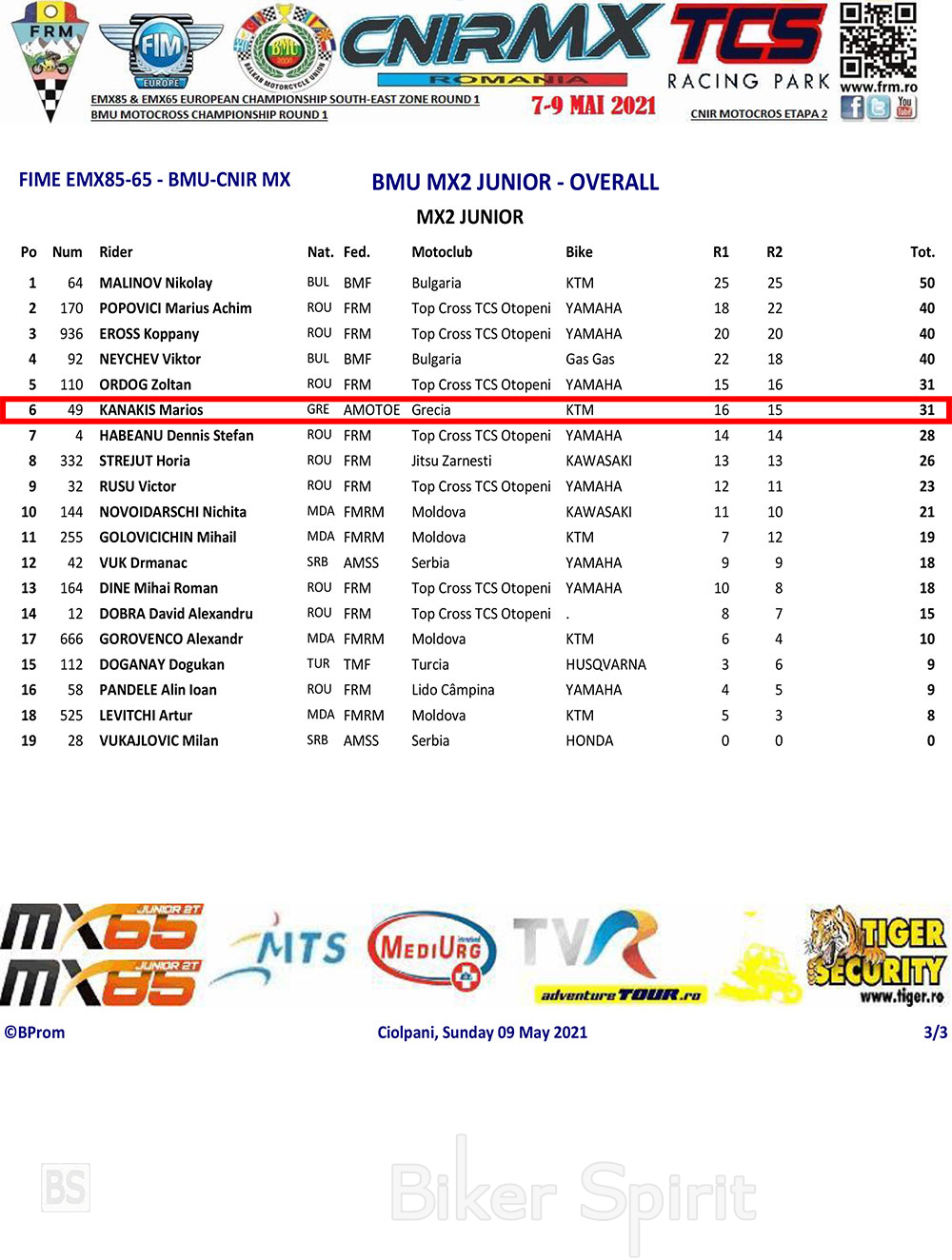Ο Μάριος Κανάκης τερμάτισε στην 7η θέση συνολικά στην MX2, με μια 8η και μια 7η θέση στα δυο σκέλη, ενώ τερμάτισε στην 6η θέση στην ΜΧ2-Junior με μια 5η και μια 6η θέση στα δυο σκέλη.