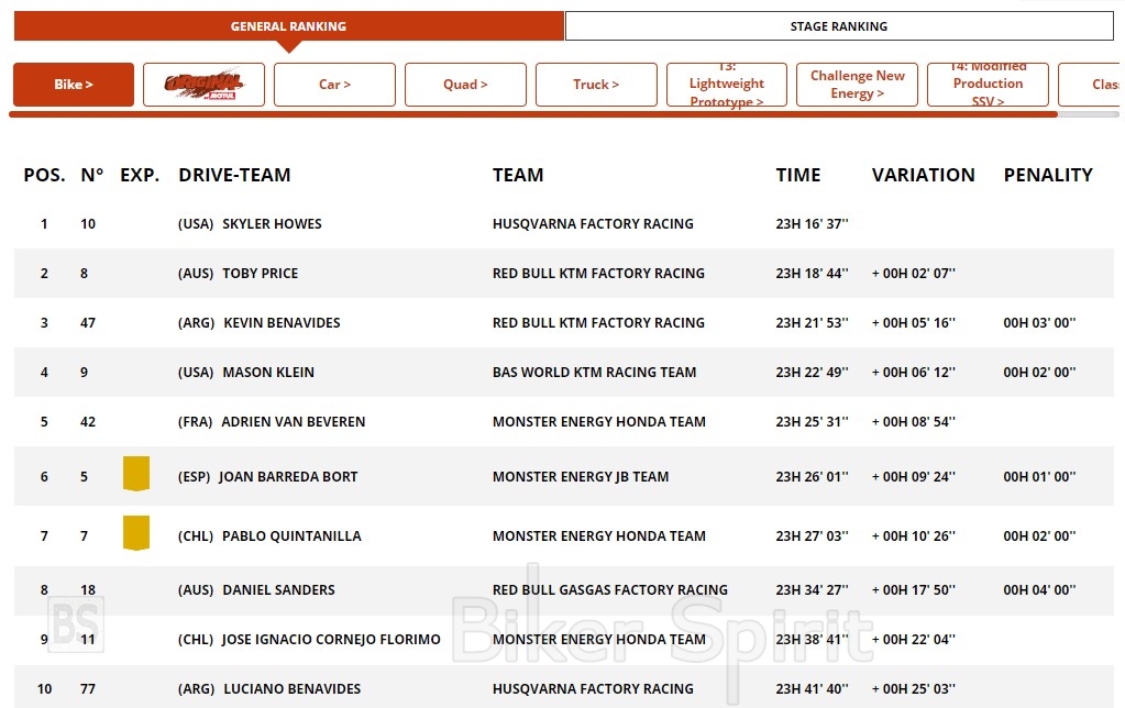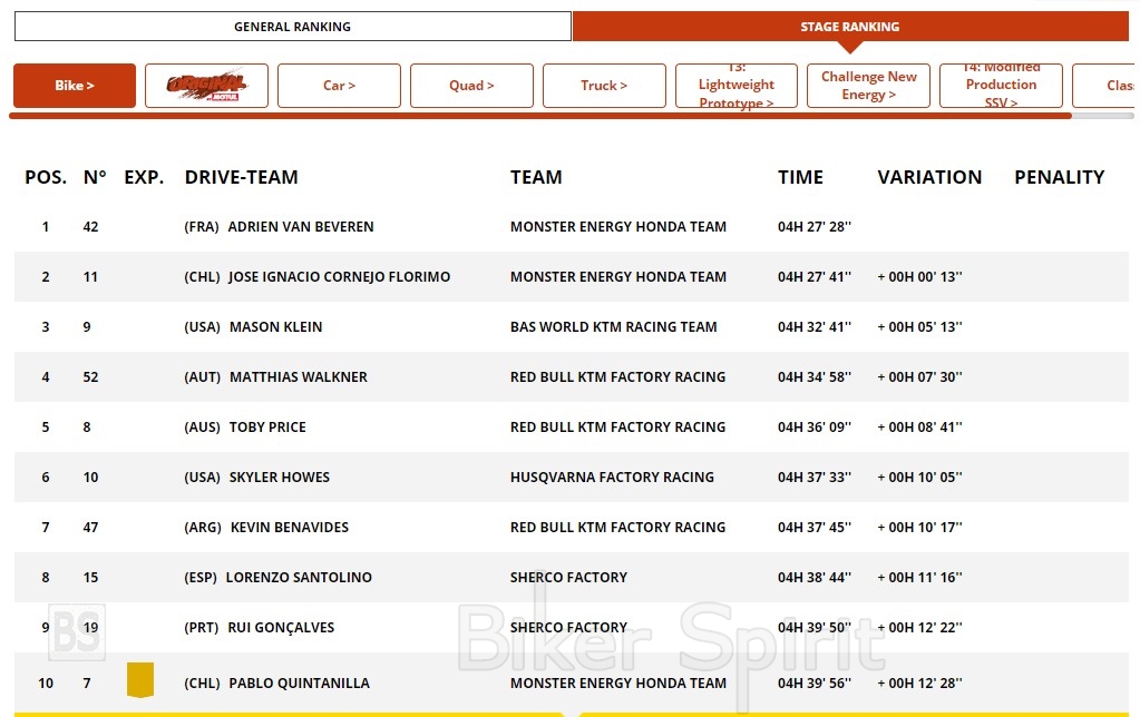 Στη γενική κατάταξη, ο van Beveren είναι πλέον ο καλύτερος οδηγός της Honda, λίγο πιο μπροστά από τον συνάδελφό του Barreda. Με έλλειμμα λιγότερο από πέντε λεπτά, και οι δύο εξακολουθούν να έχουν πιθανότητες για τον φετινό θρίαμβο του Ντακάρ.