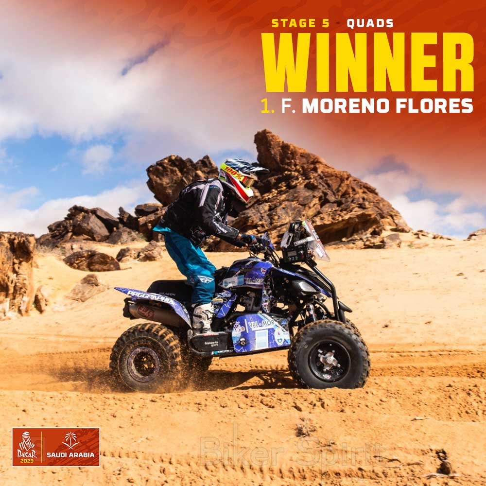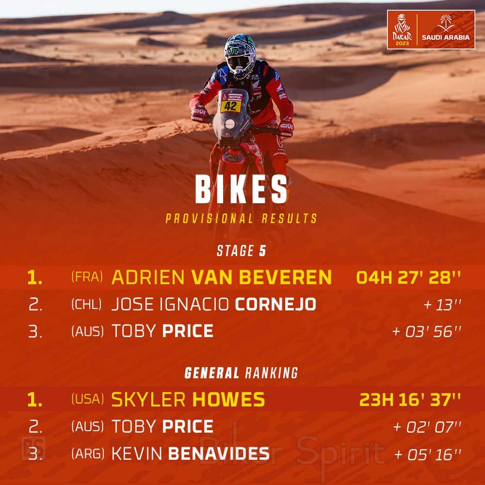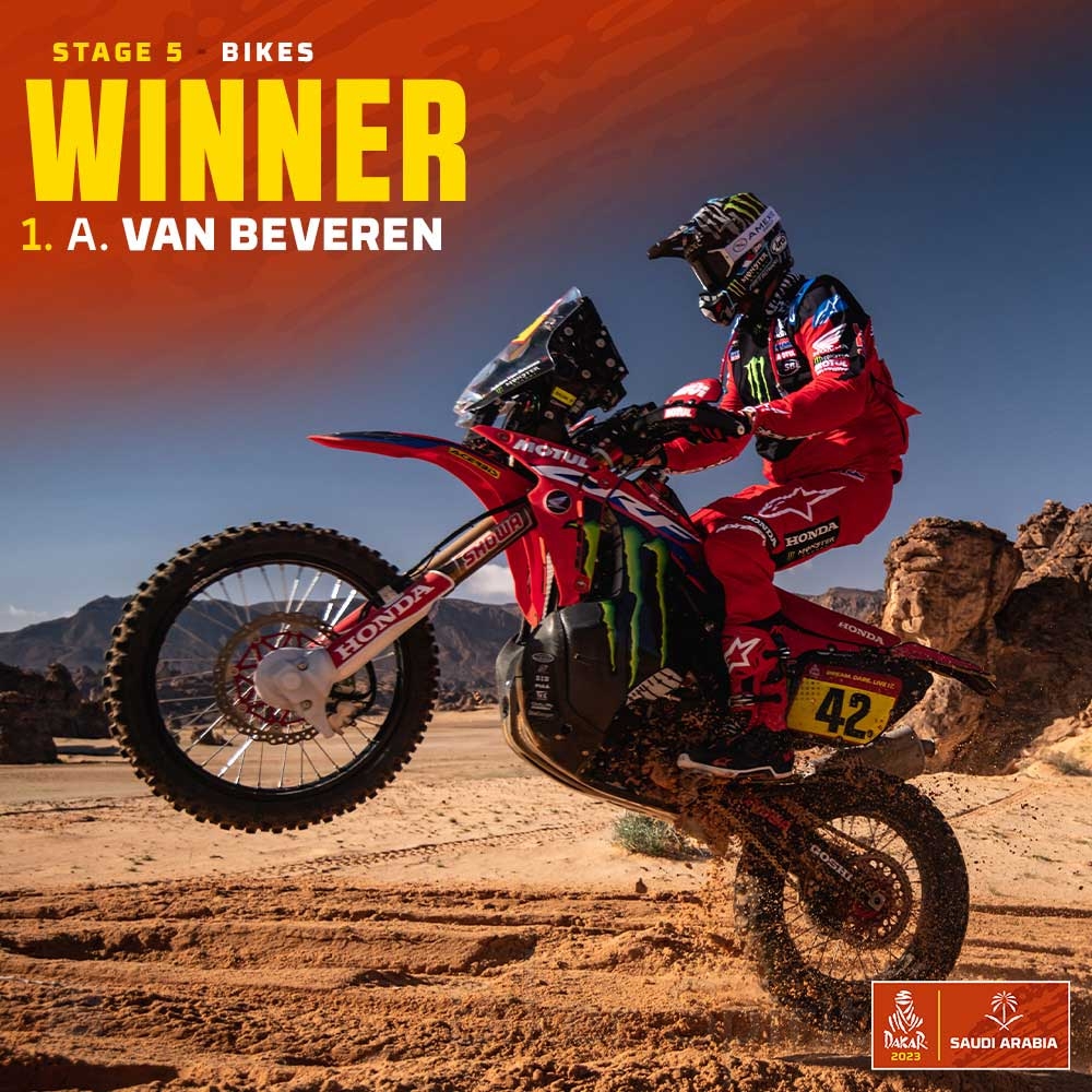 Με 4:27:41 ώρες και 13 δευτερόλεπτα μπροστά από τον συμπαίκτη του στη Honda, Cornejo, ο Adrien van Beveren κέρδισε τελικά την 5η ειδική και επωφελήθηκε από το νέο σύστημα μπόνους, ενώ χάρισαν στην Honda το 1-2.