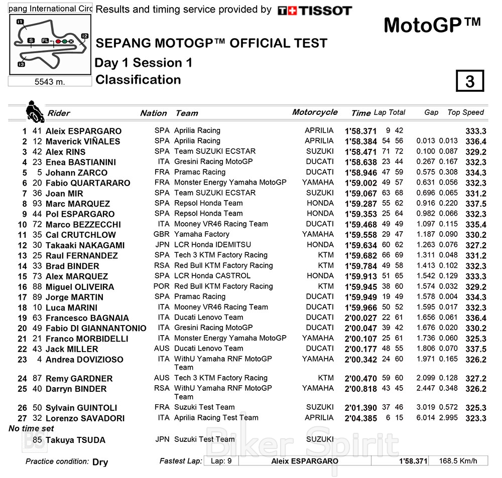 Η πρώτη μέρα των πρώτων επίσημων δοκιμαστικών MotoGP για το 2022 στο Sepang τέλειωσε με ταχύτερο οδηγό τον Aleix Espargaro , ο οποίος ήταν ταχύτερος την τελευταία μέρα του Shakedown.
