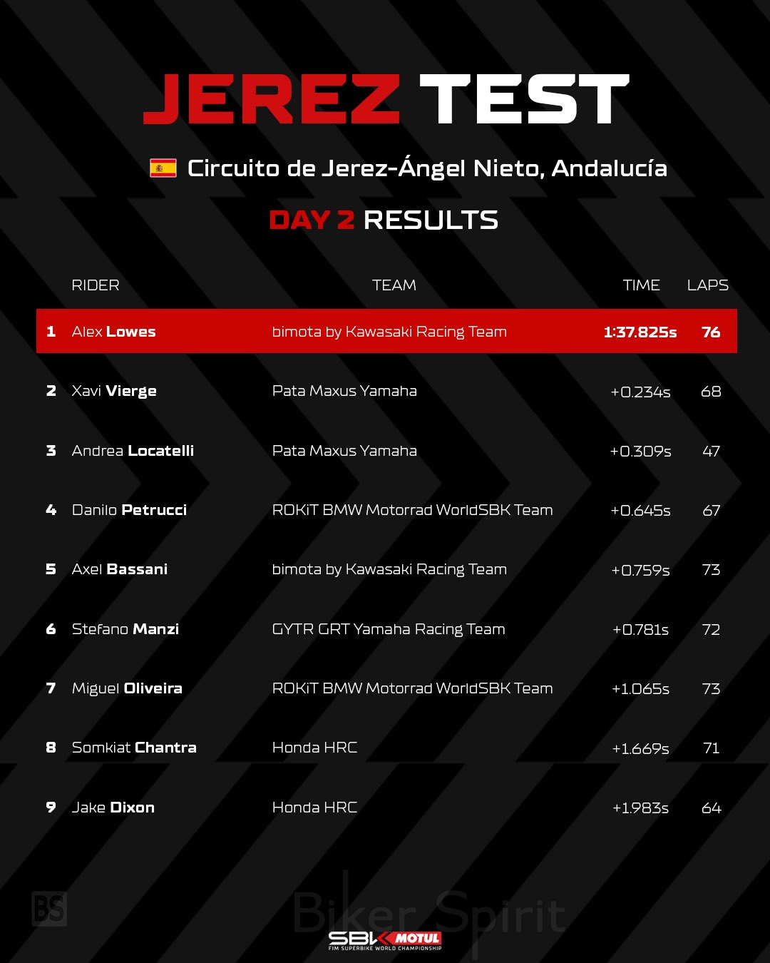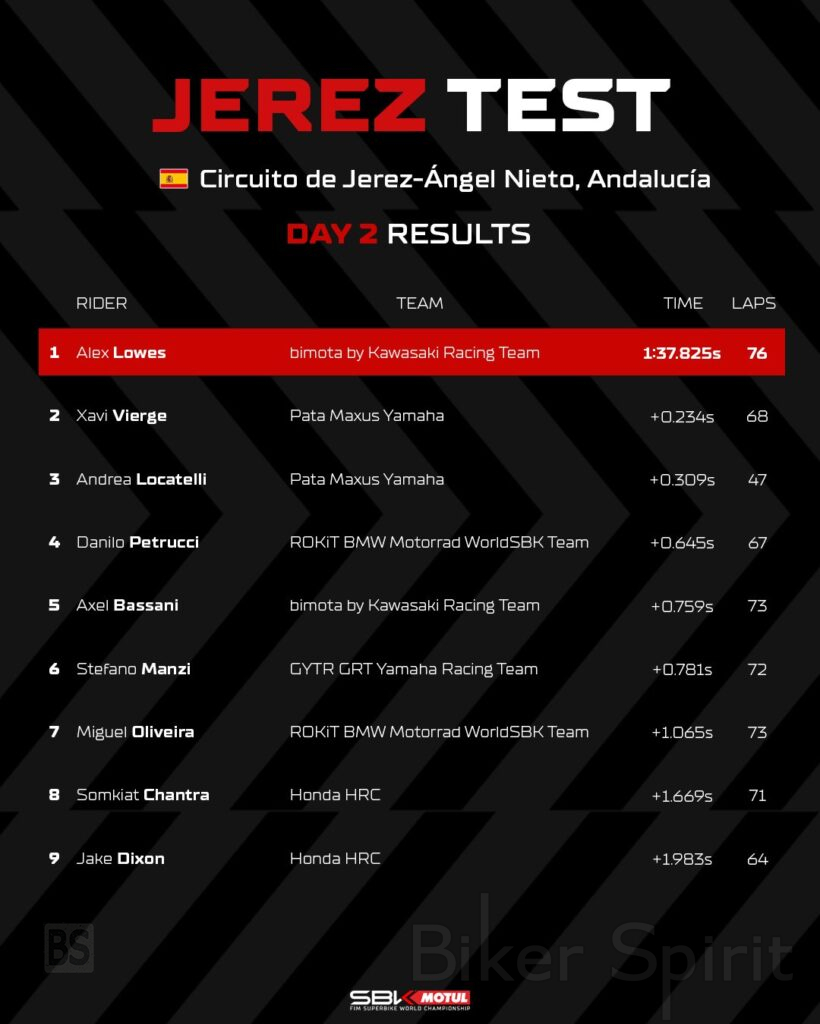 Η δεύτερη και τελευταία ημέρα δοκιμών στη Jerez ολοκληρώθηκε με τον Alex Lowes στην κορυφή της κατάταξης, βάζοντας ιδανικό τέλος στο τελευταίο test του 2025 πριν το χειμερινό διάλειμμα. Με το grid των full–time αναβατών να έχει πλέον διαμορφωθεί για το 2026, οι ομάδες επικεντρώθηκαν πλήρως στη βελτιστοποίηση των πακέτων τους ενόψει του πρώτου γύρου στη Phillip Island, στις 20 Φεβρουαρίου 2026.