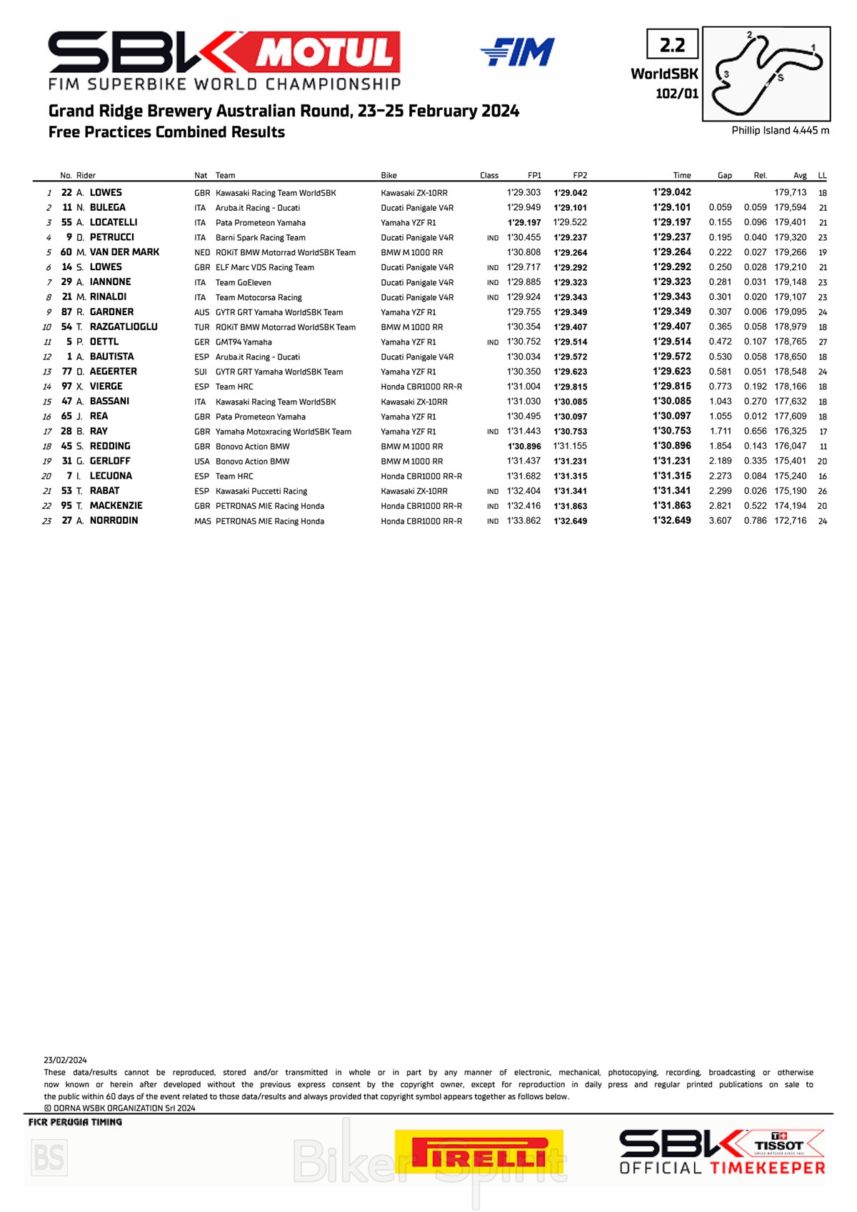 Με το FP2 έκλεισε η πρώτη ημέρα δοκιμών για τον 1ο γύρο του Παγκοσμίου Πρωταθλήματος Superbike 2024 στο Phillip Island.