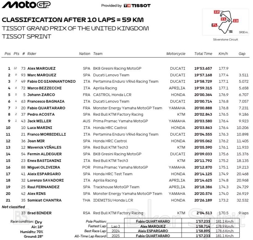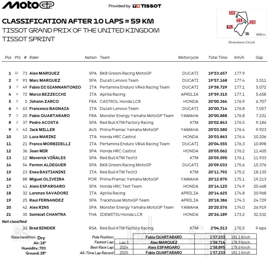 Ο Alex Marquez κέρδισε το Sprint για φέτος στο Silverstone, σπάζοντας το σερί του αδερφού του, Marc Marquez ο οποίος τερμάτισε δεύτερος με διαφορά 3.511s από τον πρώτο και μπροστά από τον Fabio Di Giannantonio που συμπλήρωσε το βάθρο!