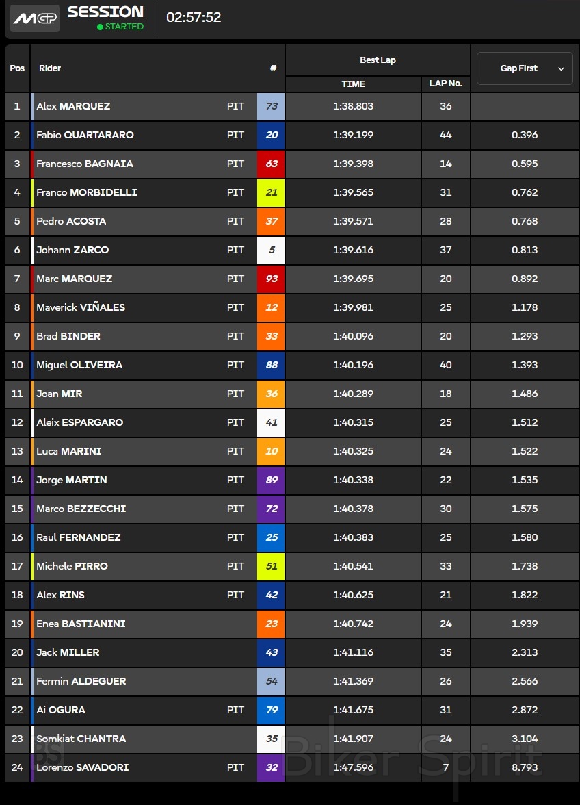 Η πρώτη έξοδος του οκτώ φορές πρωταθλητή στην πίστα με τα νέα του χρώματα, σε αυτό το ολοκόκκινο στοίχημα που λέει ο ίδιος, ήταν στις 11:15, δέκα λεπτά μετά την πρεμιέρα του Martinator σε ένα RS-GP που ακόμα δεν δείχνει αναμενόμενο νούμερο 1 πρωταθλητή, αλλά έχει δύο πανέμορφα αστέρια, ένα για τον τίτλο, αυτό του Moto3 του 2018 και αυτό του MotoGP του 2024, που αναγνωρίζονται από μακριά.