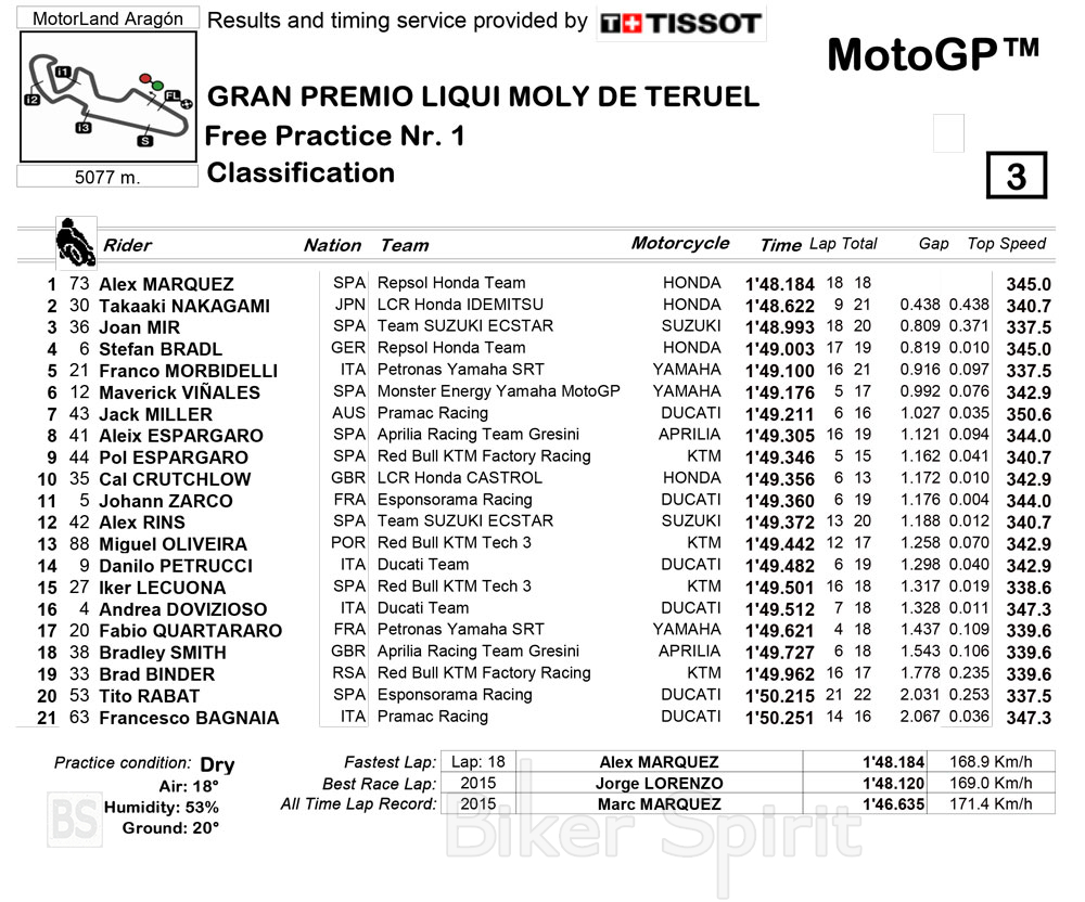 Ο αναβάτης της Repsol Honda Team, δεύτερος την περασμένη Κυριακή στον αγώνα του Aragon 1, έγραψε τον καλύτερο χρόνο με 1:48.184, ενώ στον τελευταίο γύρο στην προσπάθεια του να γράψει έναν ακόμα ταχύτερο γύρο είχε πτώση, ευτυχώς χωρίς συνέπειες.