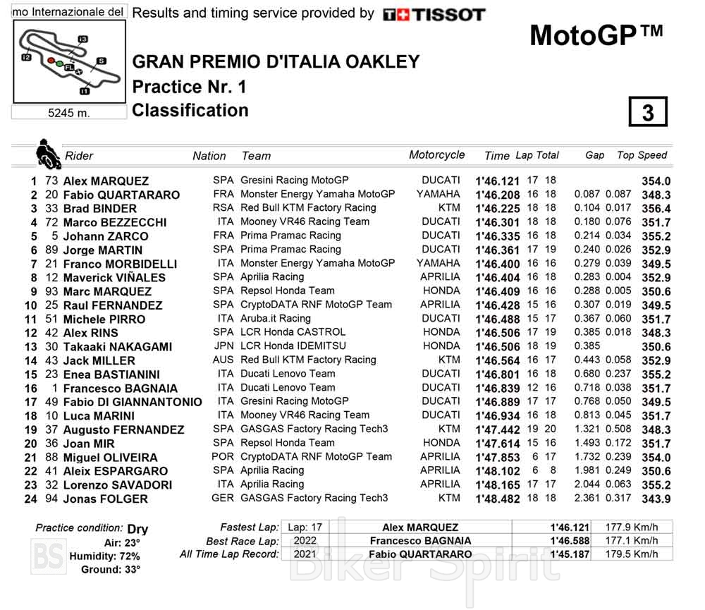 Ο “El Diablo” που πήρε τον καλύτερο γύρο του στο 16ο από τα 18 περάσματα που έκανε, είναι στην 2η θέση μπροστά από το πρώτο KTM του Brad Binder με μόλις 17 χιλιοστά. Το RC16 του Αυστριακού κατασκευαστή αποδείχθηκε ανταγωνιστικό και στην πίστα της Τοσκάνης, αφού είχε καλές επιδόσεις από την αρχή της σεζόν.